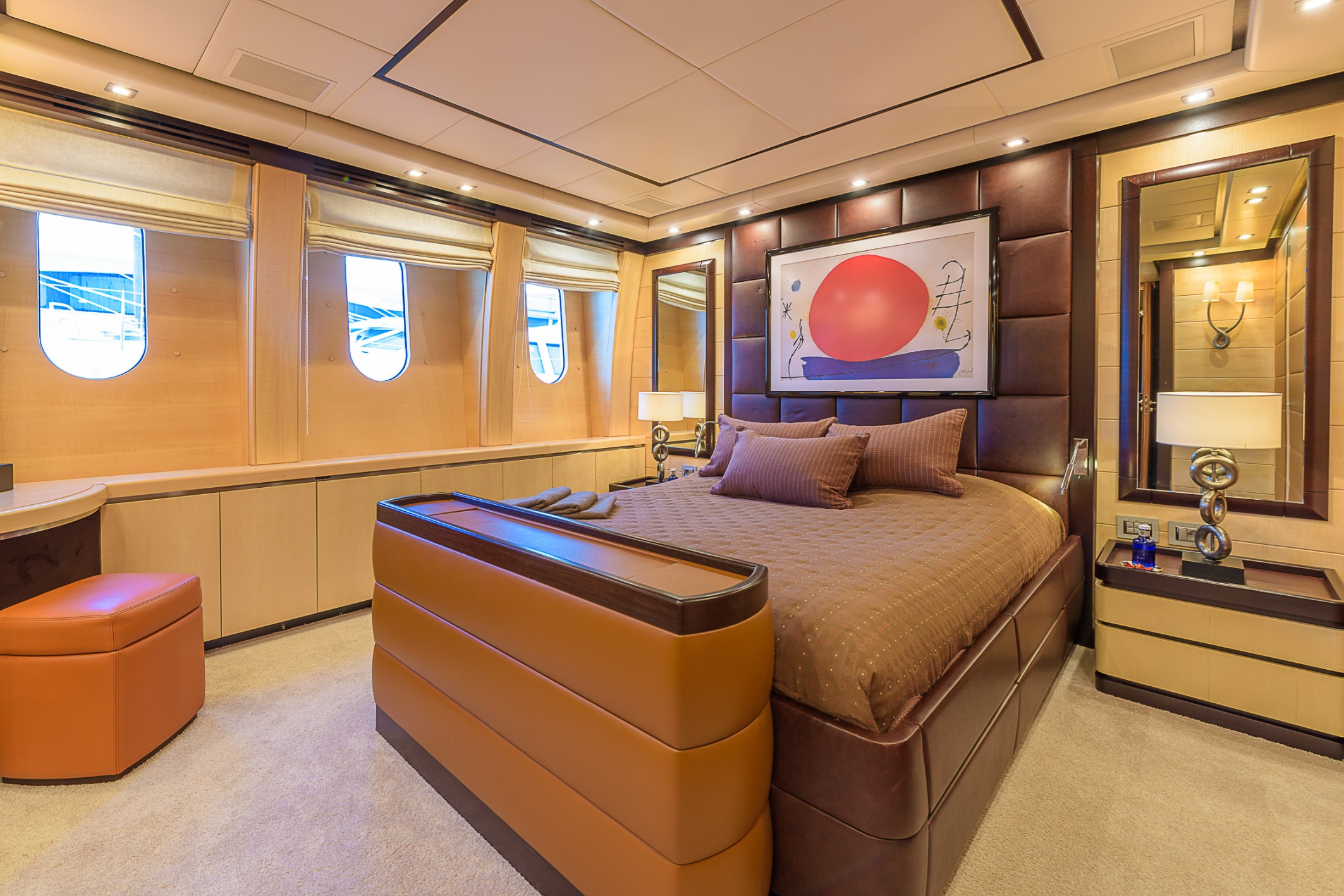 On the upper deck, the aft section has a circular alfresco dining table for 10 for atmospheric outdoor meals at sundown. Three sofas and a coffee table ...