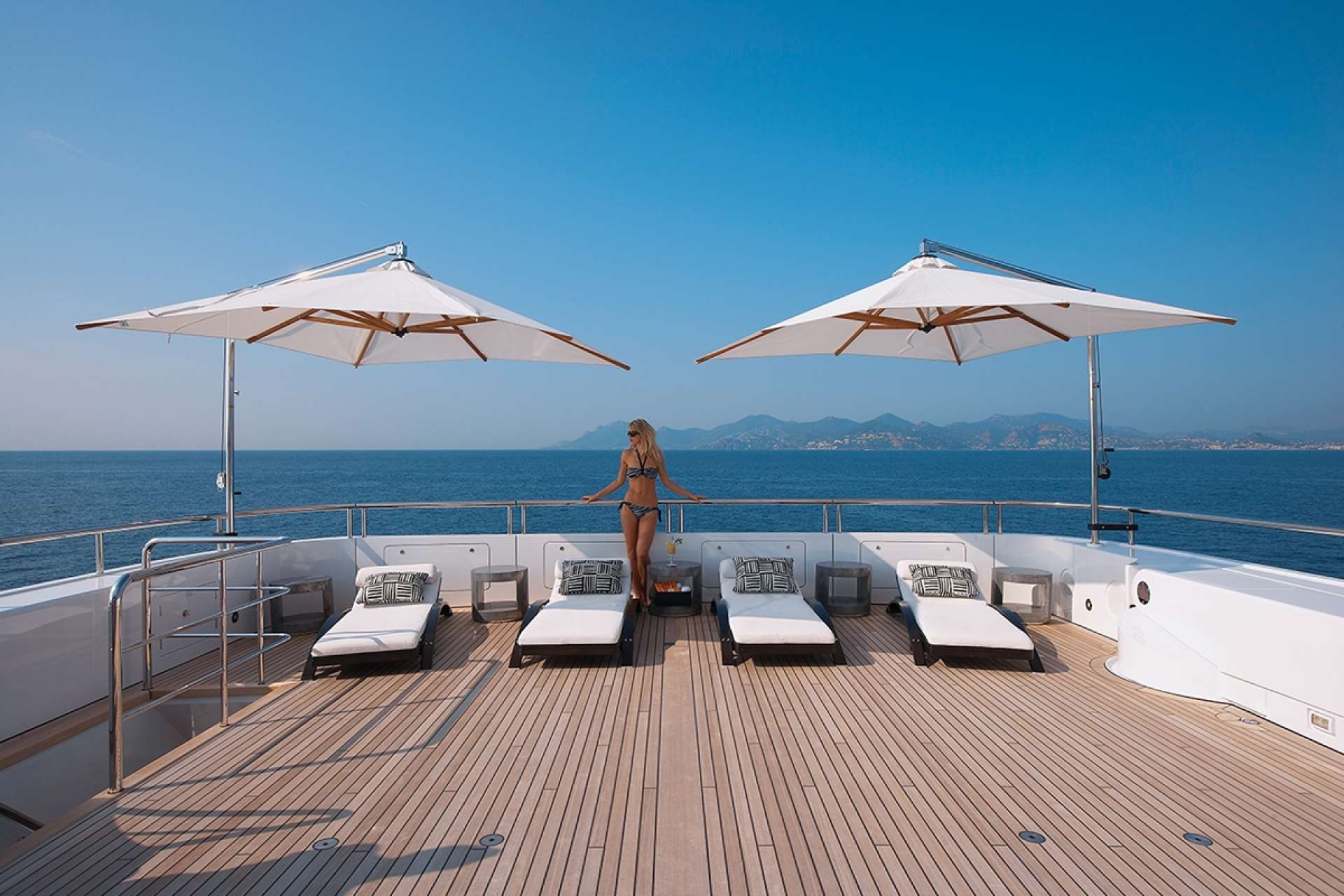 The main deck aft has a massive sofa that surrounds an elevated table ideal for casual alfresco dining or rest after playing in the sea.