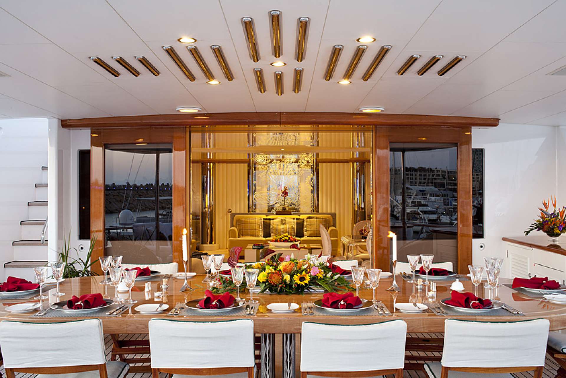 A passageway around the galley leads to the main salon, where the formal dining area to seat 12 is placed forward and the centrally located bar efficiently serves guests while dining or lounging on the extensive sofa opposite.
