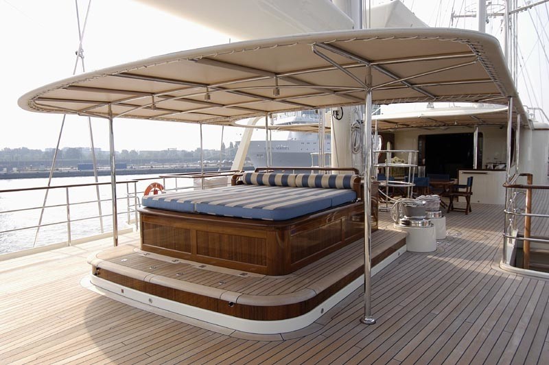 Above, guests can unwind on the sun pads in front of the helm station, or dine alfresco on the bridge deck aft.