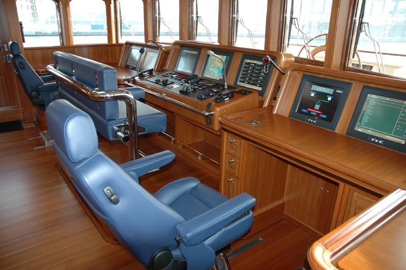 Above, guests can unwind on the sun pads in front of the helm station, or dine alfresco on the bridge deck aft.