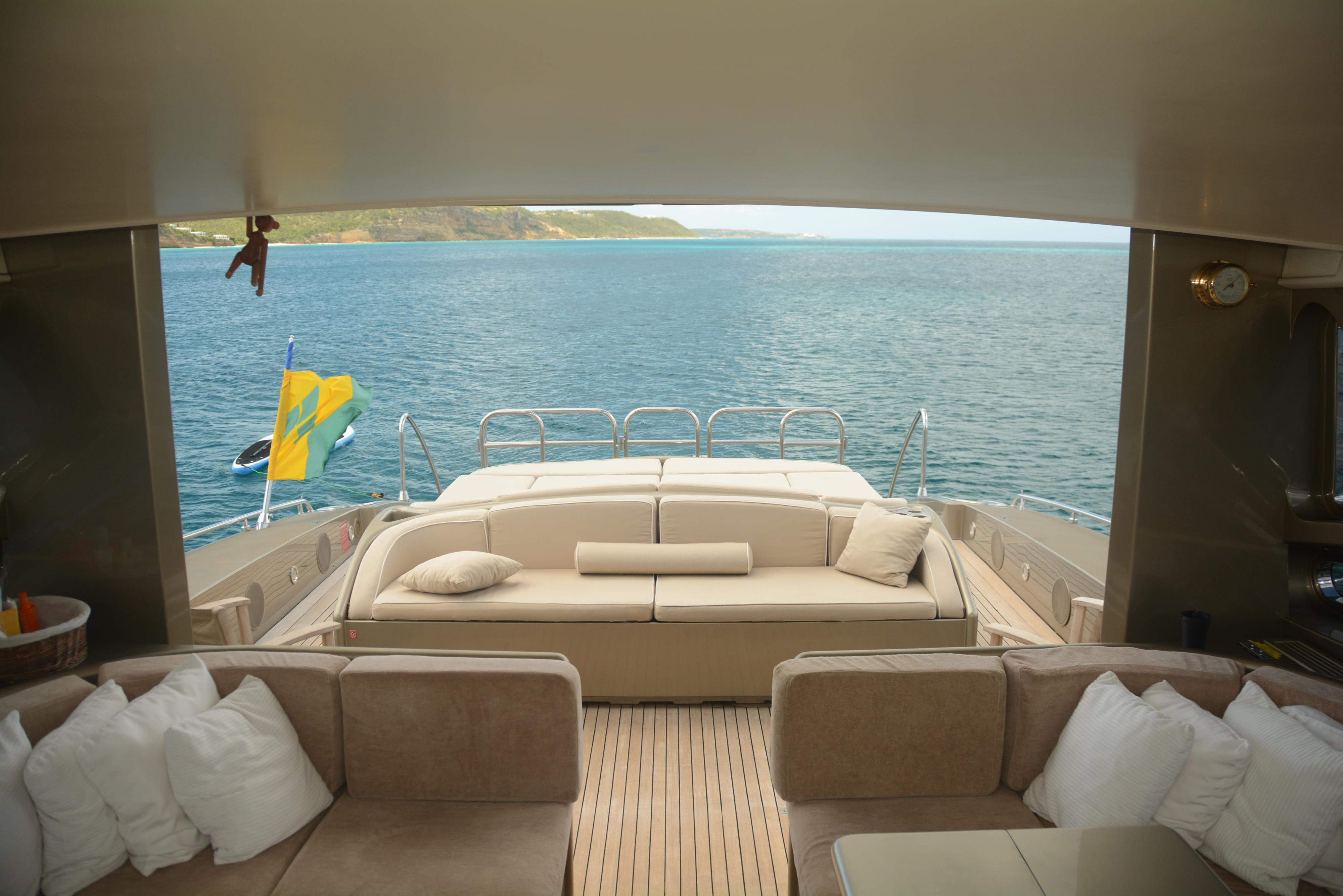 The aft deck offers a large sunbed and seating area, which easily transforms into an alfresco dining table. Dual transom steps lead to the swim platform, where guests can effortlessly enjoy the vast assortment of water toys on offer.