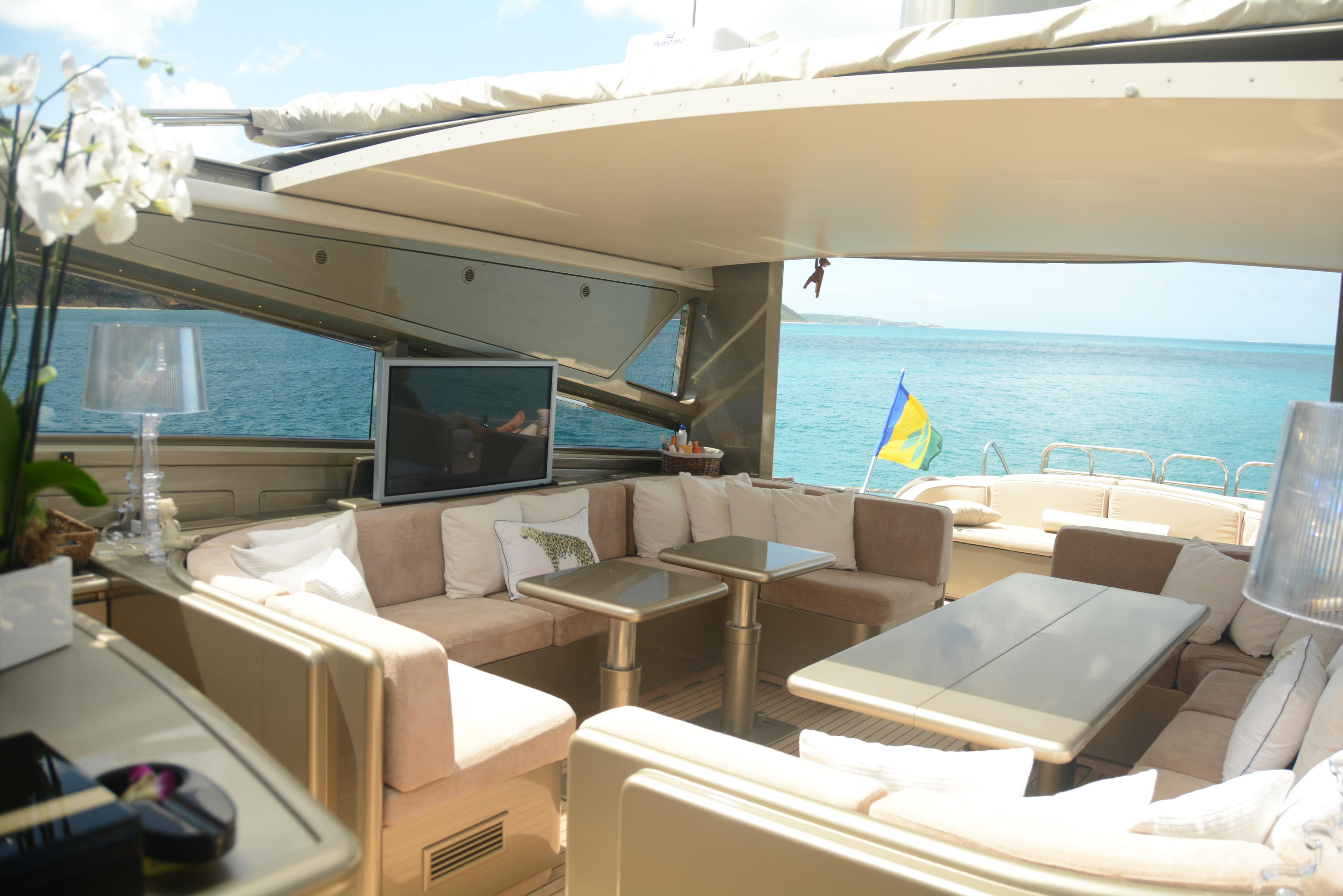 Her exterior space naturally flows from the upper salon, which is ideal for socializing. The aft deck offers a large sunbed and seating area, which easily transforms into an alfresco dining table. Dual transom steps lead to the swim platform, where guests can effortlessly enjoy the vast assortment of water toys on offer.
