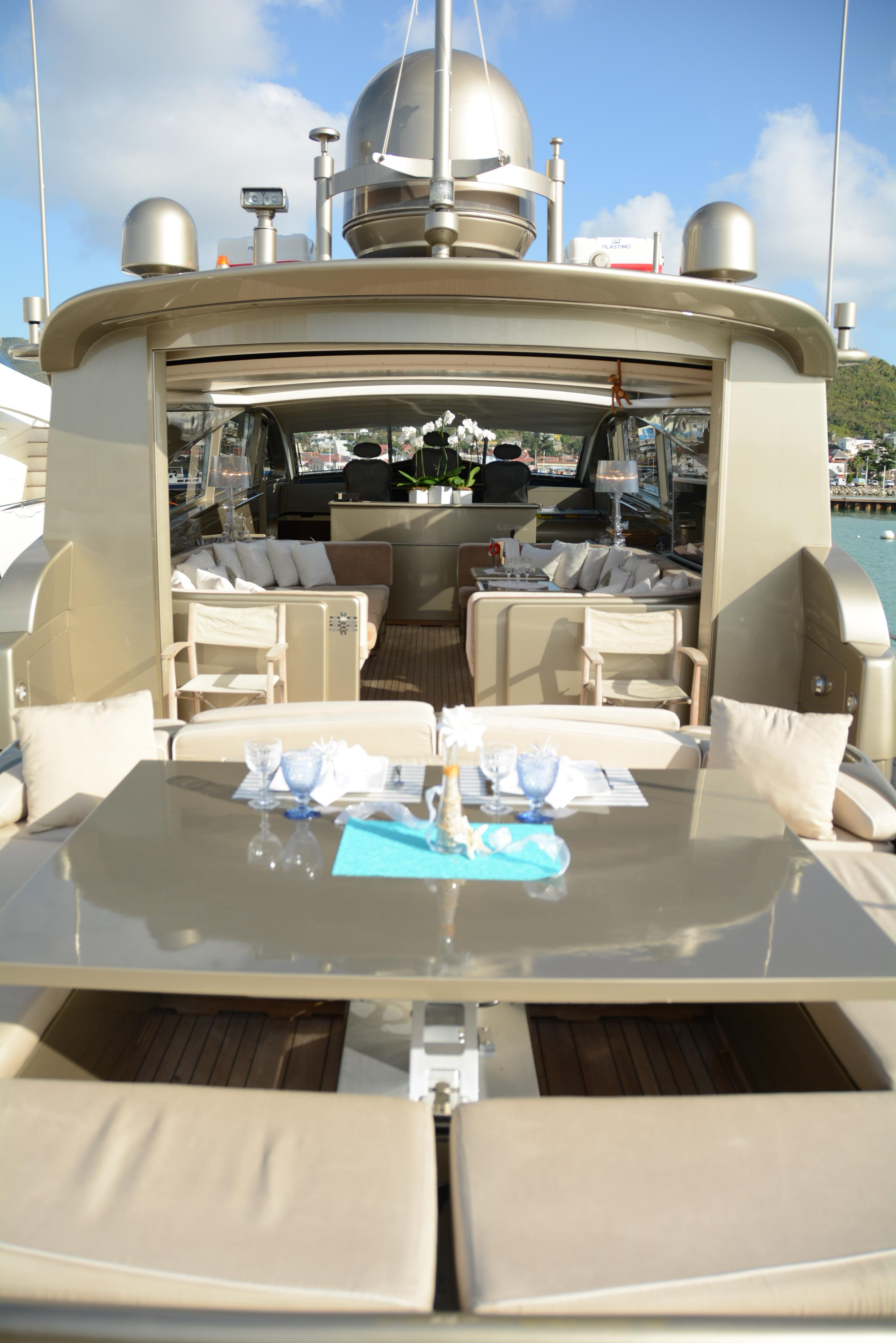 The aft deck offers a large sunbed and seating area, which easily transforms into an alfresco dining table. Dual transom steps lead to the swim platform, where guests can effortlessly enjoy the vast assortment of water toys on offer.