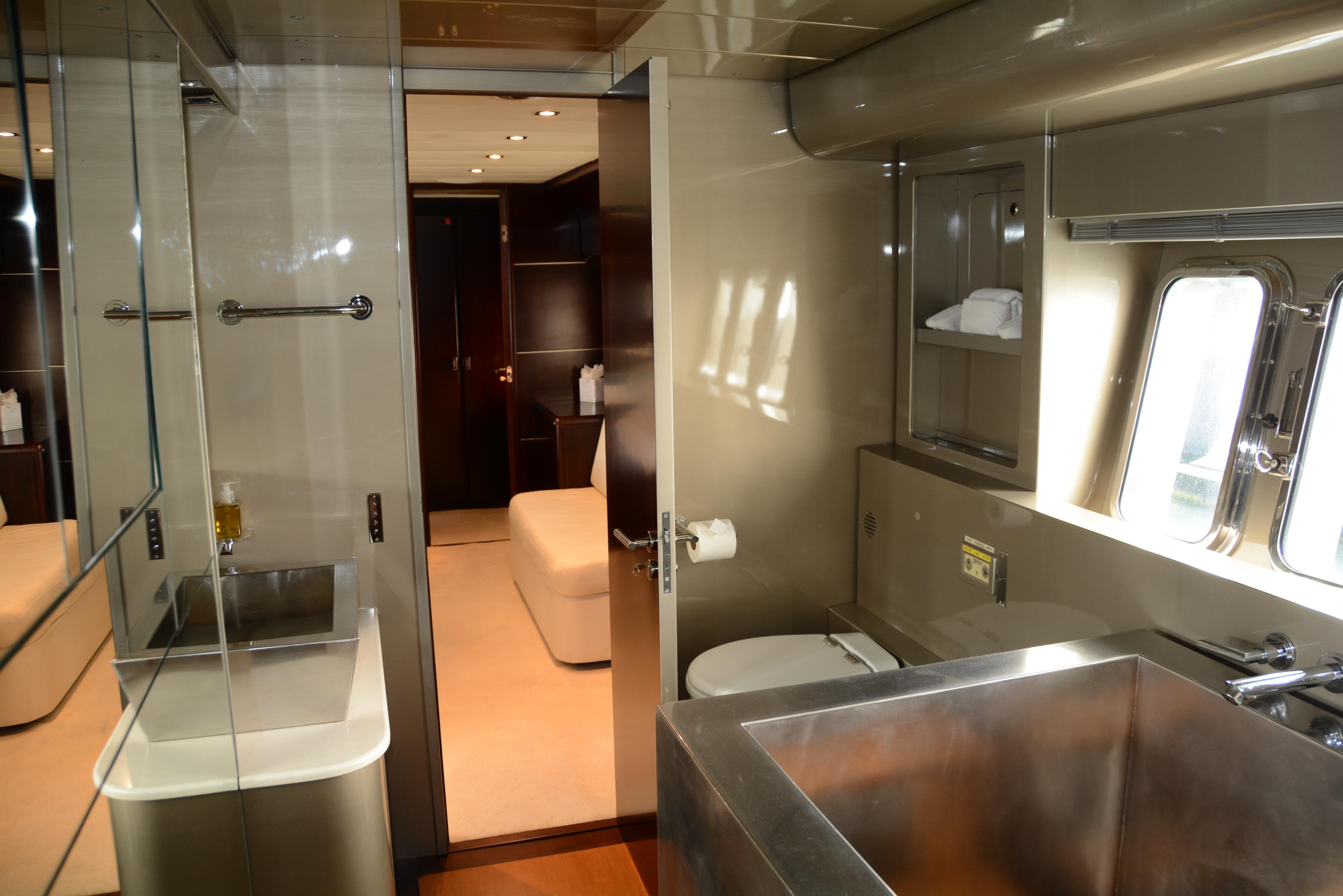 The yacht accommodates 7 guests, with 3 ensuite cabins.