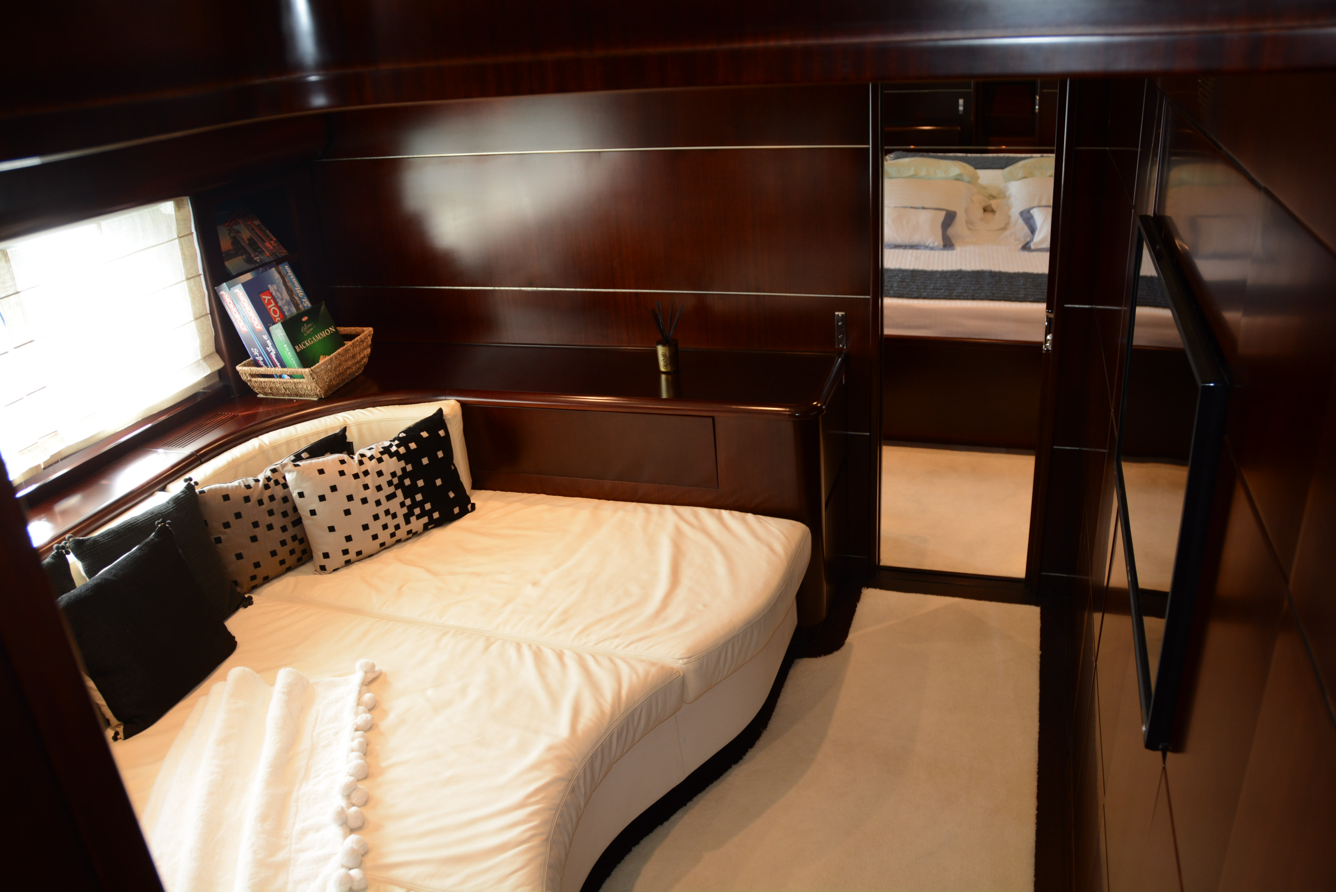 A drop-down TV provides entertainment if requested. Below decks are 3 guest cabins, each with their own ensuite, plus a TV room that connects to the master, or can be separated.