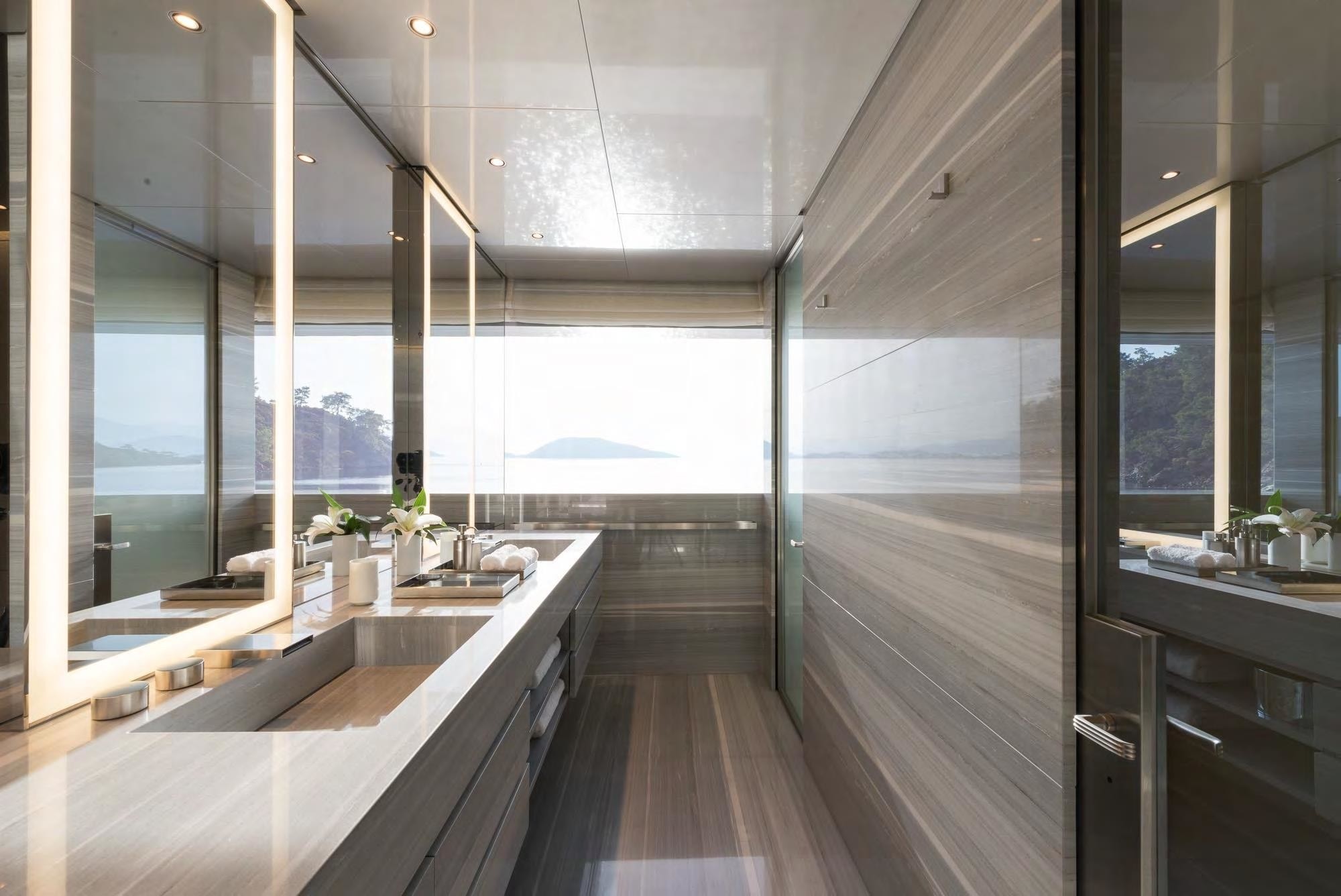 The Master suite is located forward and is accessed via a curving hallway, passing a lounge, en-suite bathroom, walk-in wardrobe and study. Full-height windows flood the interior with natural light and guests in this suite can look out to the sides and over the bow for sweeping views.