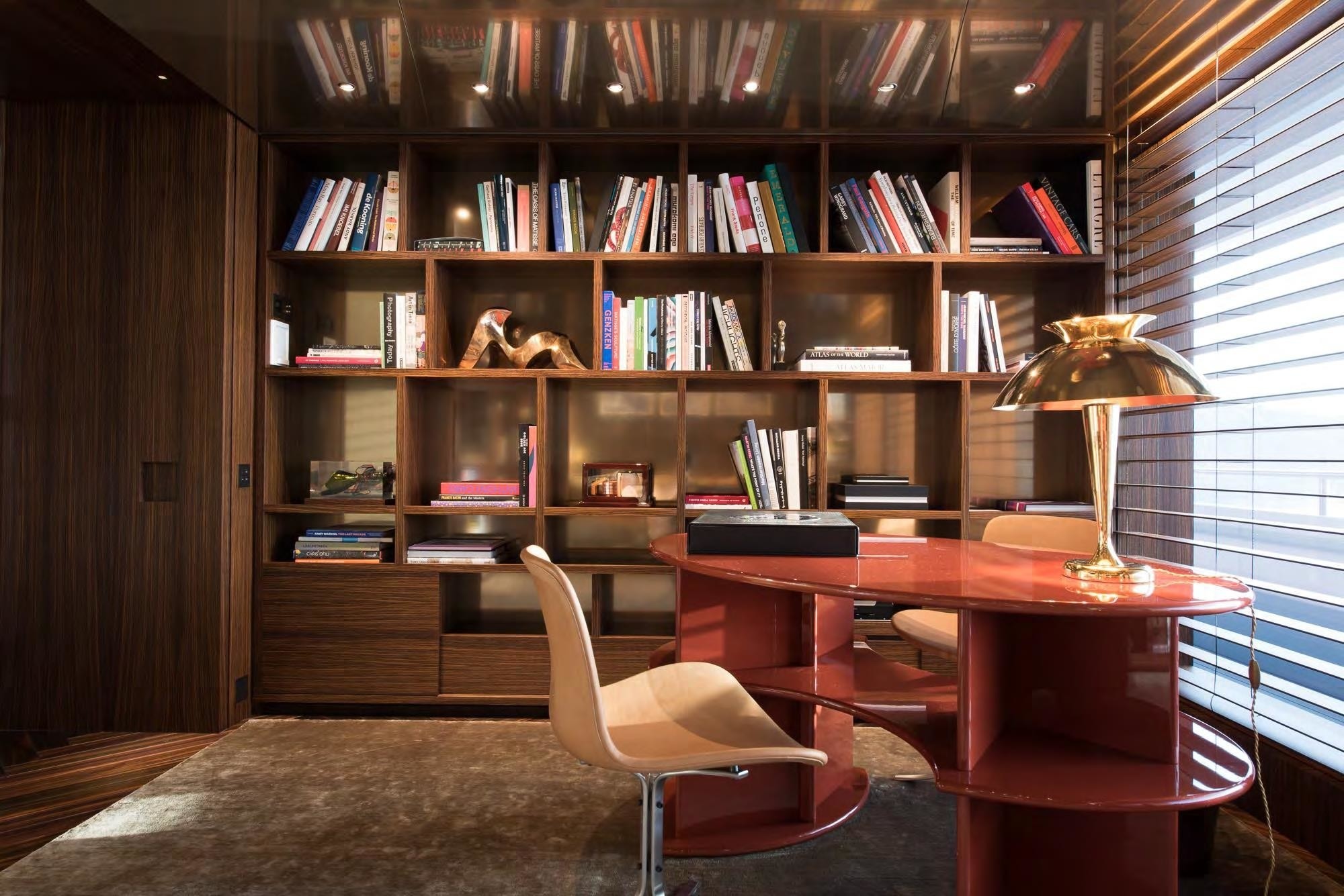 The Master suite is located forward and is accessed via a curving hallway, passing a lounge, en-suite bathroom, walk-in wardrobe and study. Full-height windows flood the interior with natural light and guests in this suite can look out to the sides and over the bow for sweeping views.