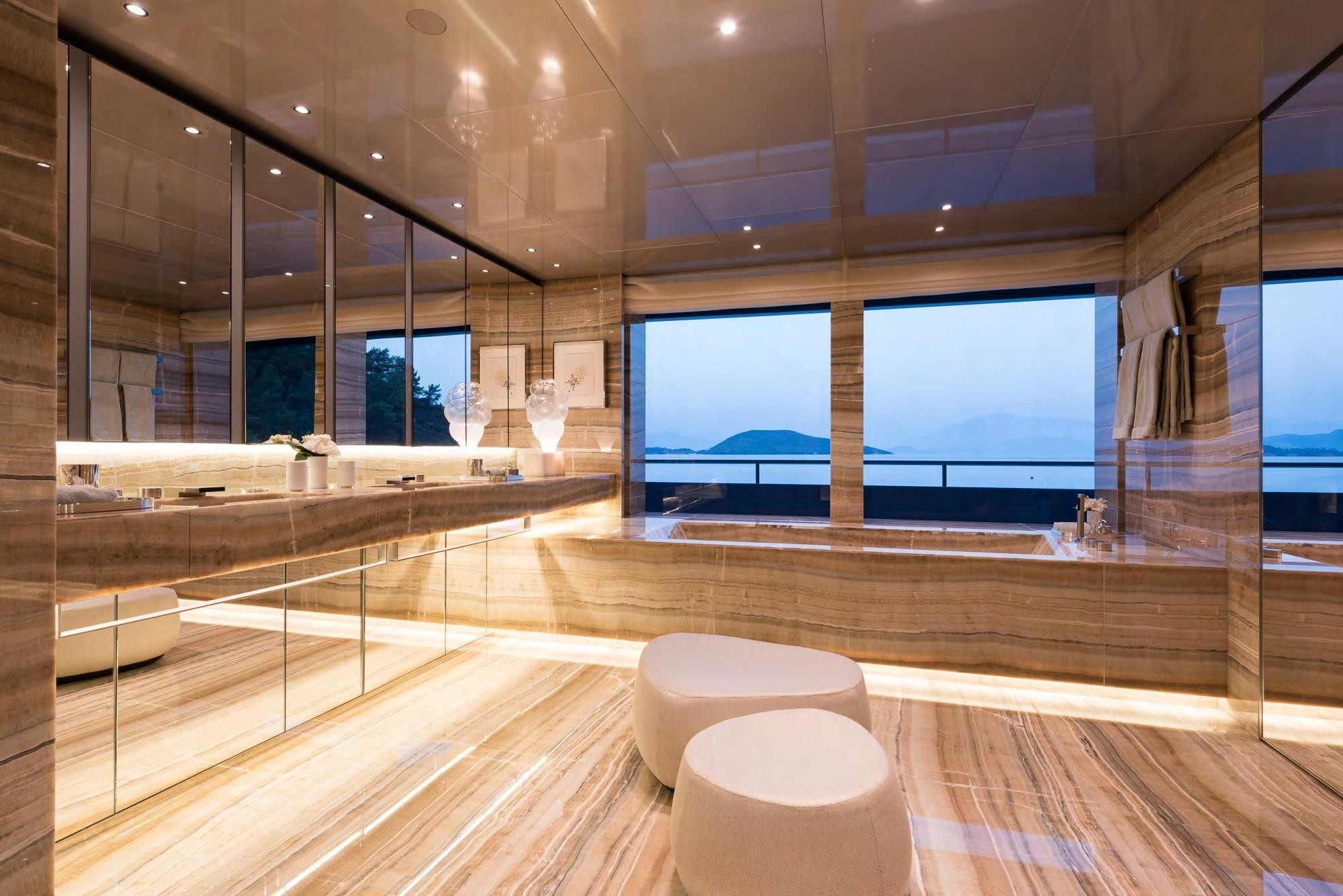 The Master suite is located forward and is accessed via a curving hallway, passing a lounge, en-suite bathroom, walk-in wardrobe and study. Full-height windows flood the interior with natural light and guests in this suite can look out to the sides and over the bow for sweeping views.