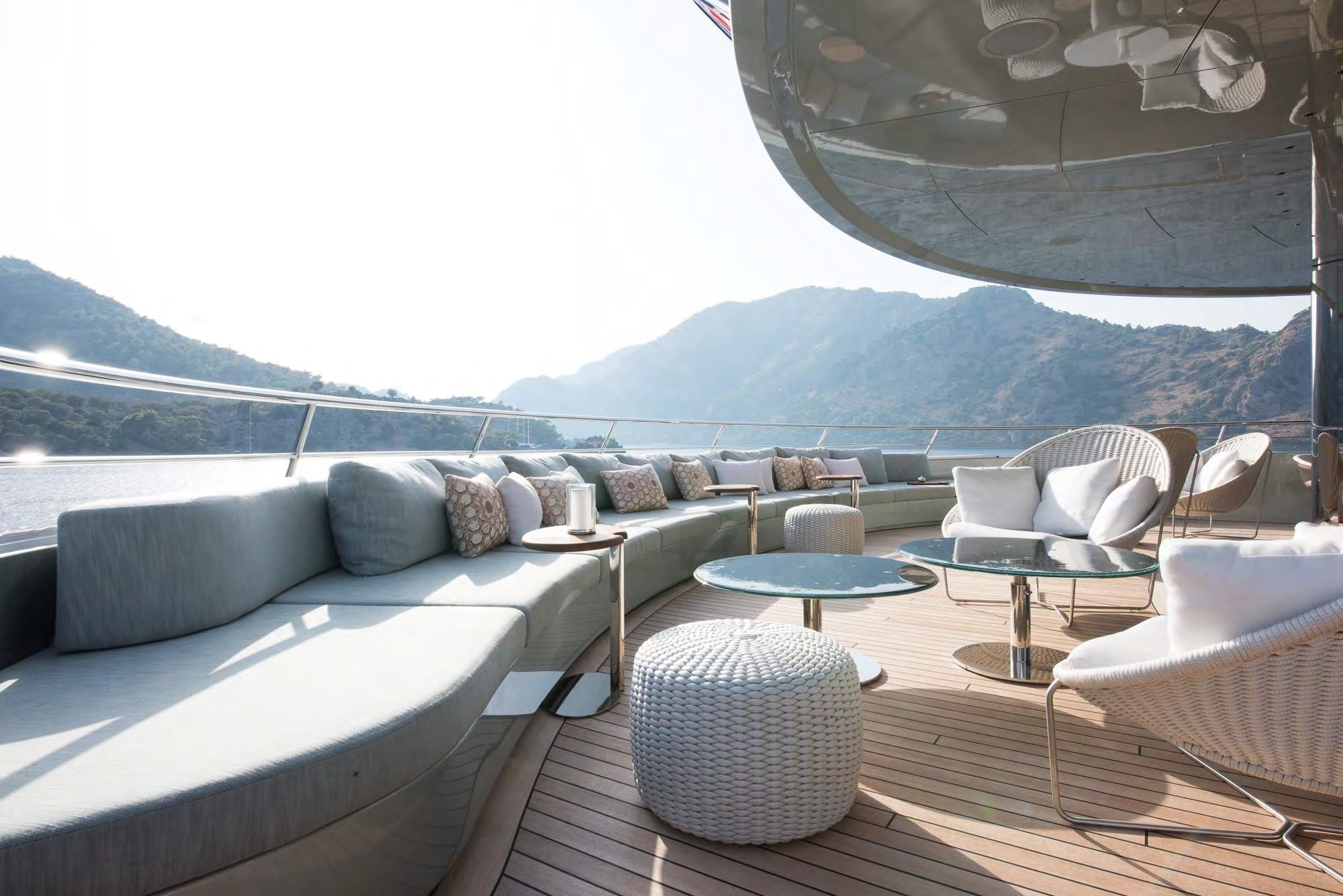 Towards the stern, the aft deck descends for easy access to the water and the tenders.