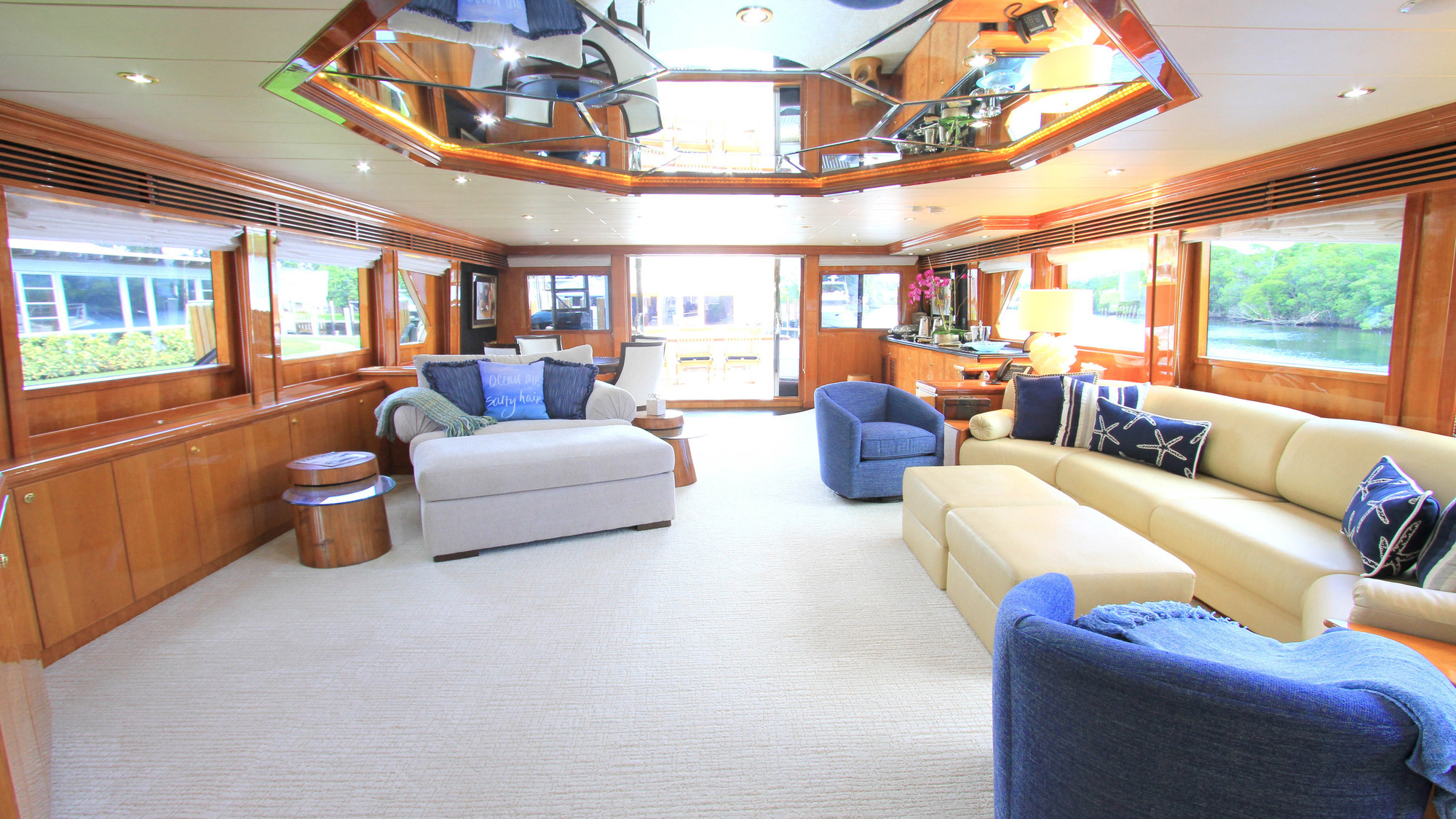 A staircase connecting the three decks divides the room, and the main salon in the aft section is fitted with an extended port-side sofa beneath the windows with an armchair on either side, plus a loveseat combined with an ...