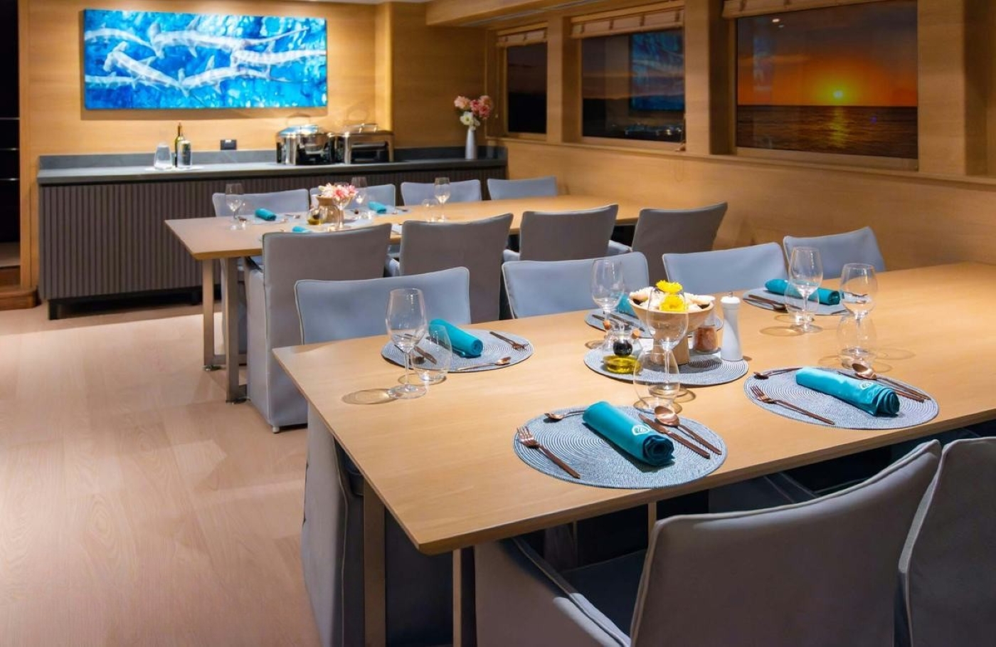 Staircases from the main deck connect the floors up to the sundeck aft; between the two, the upper deck aft is designed for alfresco dining and sunbathing with an abundance of large sun pads along the stern.