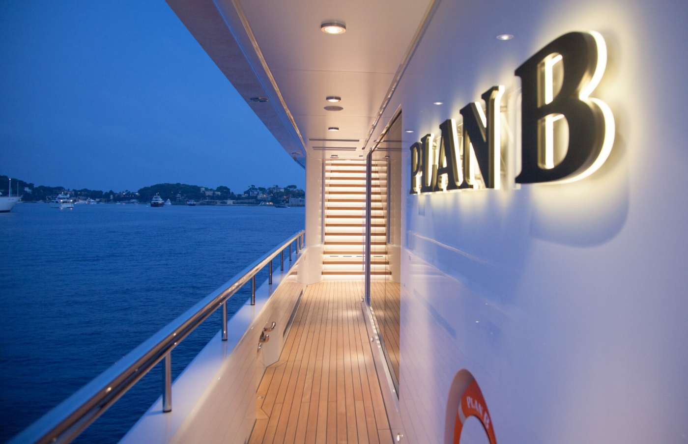 An extensive C-shaped sofa in white with black piping is located on the stern, in front of which are two coffee tables and armchairs for friends, family and visitors to gather together.