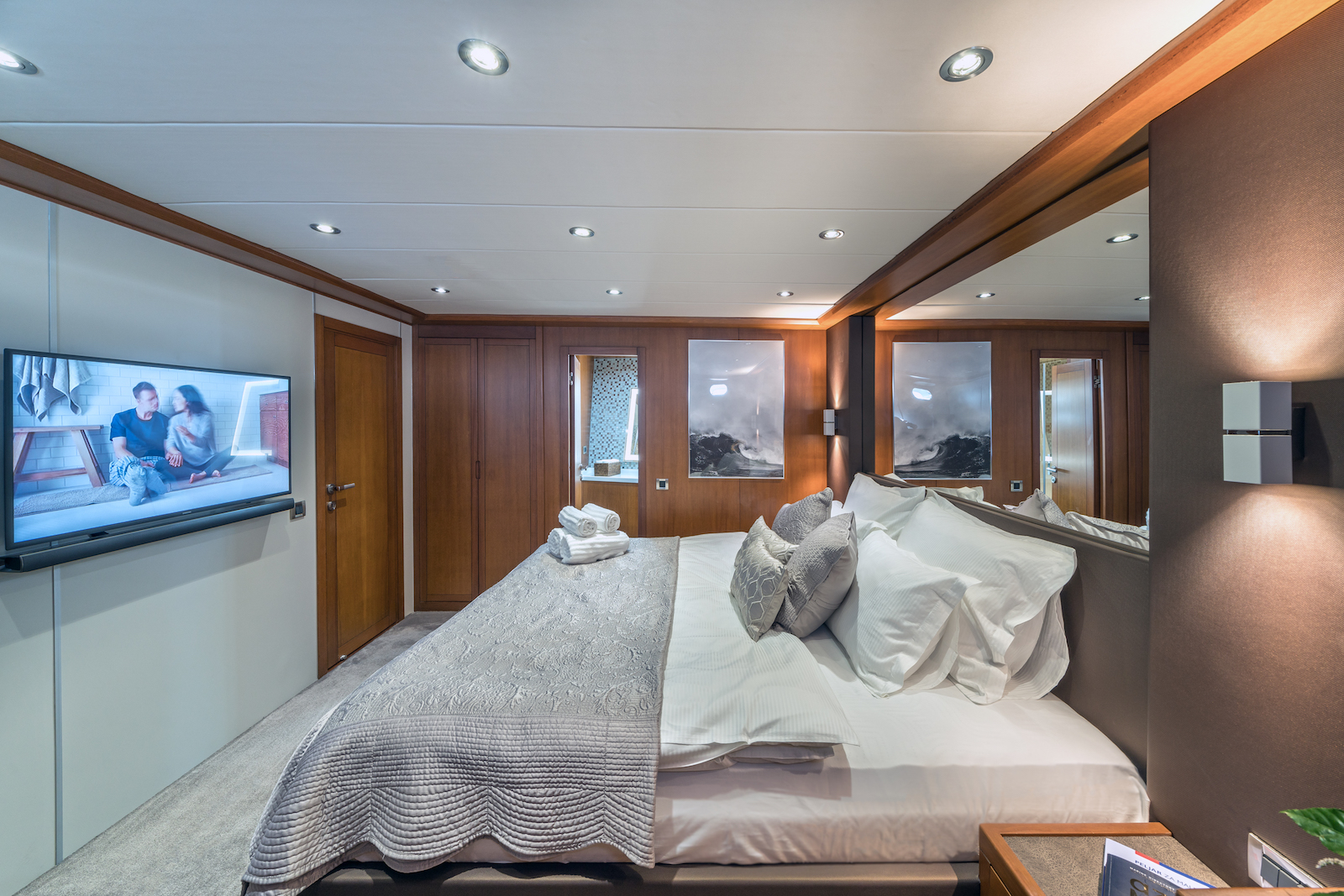 Amidships is the engine room and galley, and farther forward is the double cabin and the twin cabin, with the VIP stateroom placed forward. In the bow section are the crew accommodation and facilities.
