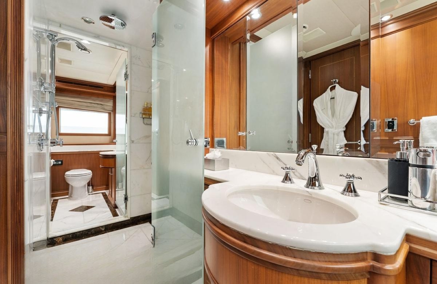 The master cabin makes good use of space with a king-sized bed and generous 'his and hers' cedar wood closets, a sofa, writing desk and naturally an ensuite bathroom. The VIP suite is a very well-appointed alternative to the master and offers similar levels of comfort, while the two guest doubles sit further forward.