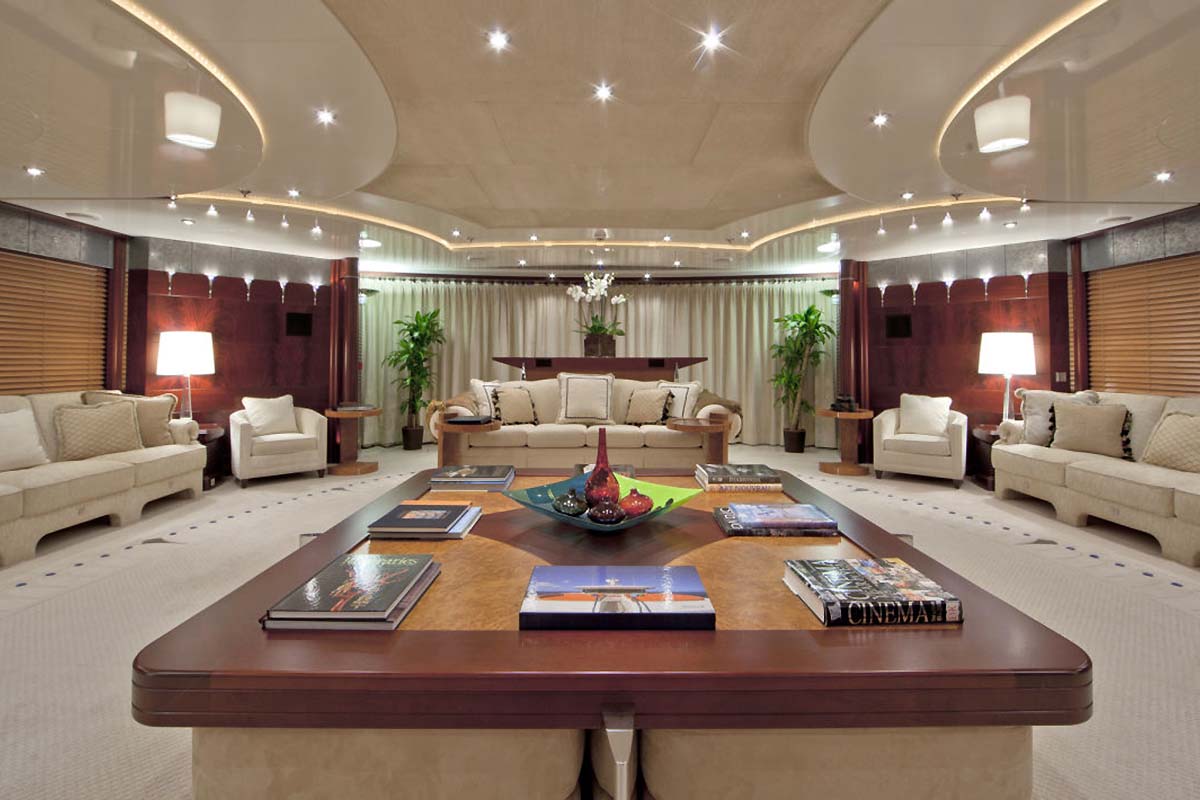 The area can be separated off from the main salon by sliding doors for a more intimate meal between 12 guests. The main salon is filled with seating around all four sides, leaving the central space clear of everything but a ...