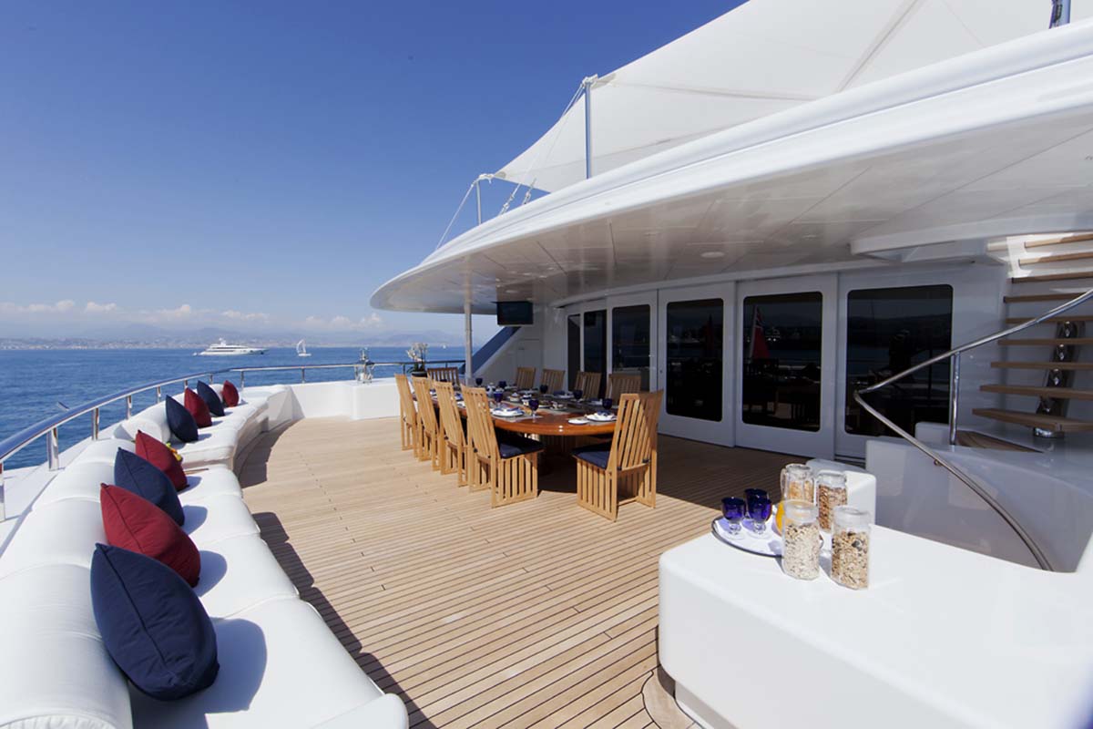 In this area, there is a row of plush seating along the stern and under the shade of the upper deck overhang, there is an alfresco dining table to seat eight.
