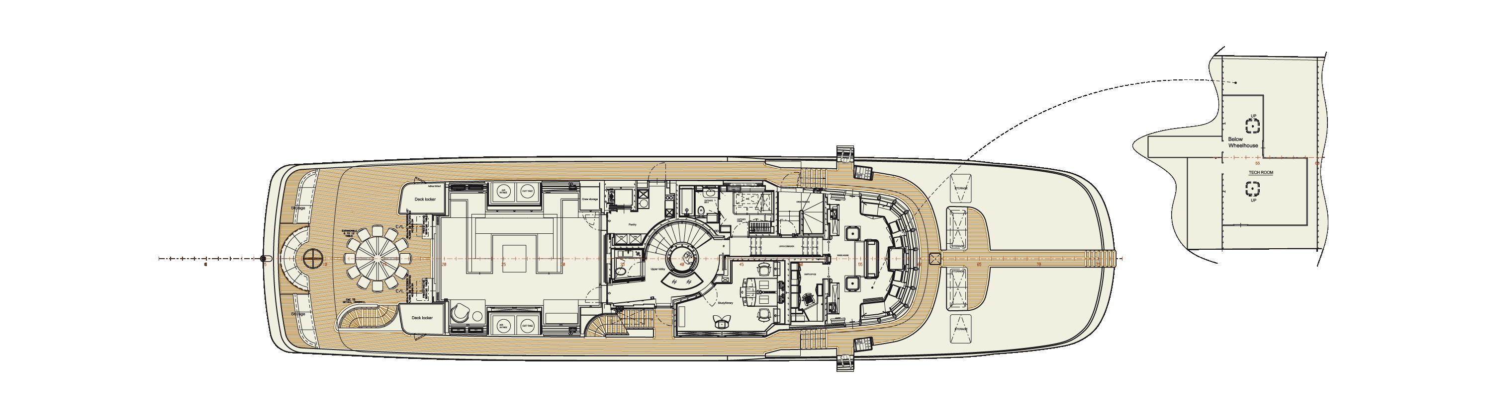 Farther forward is the guest accommodation consisting of two double cabins and two convertible twin cabins, all with en-suite facilities. The forward section is dedicated to the crew accommodation and amenities.