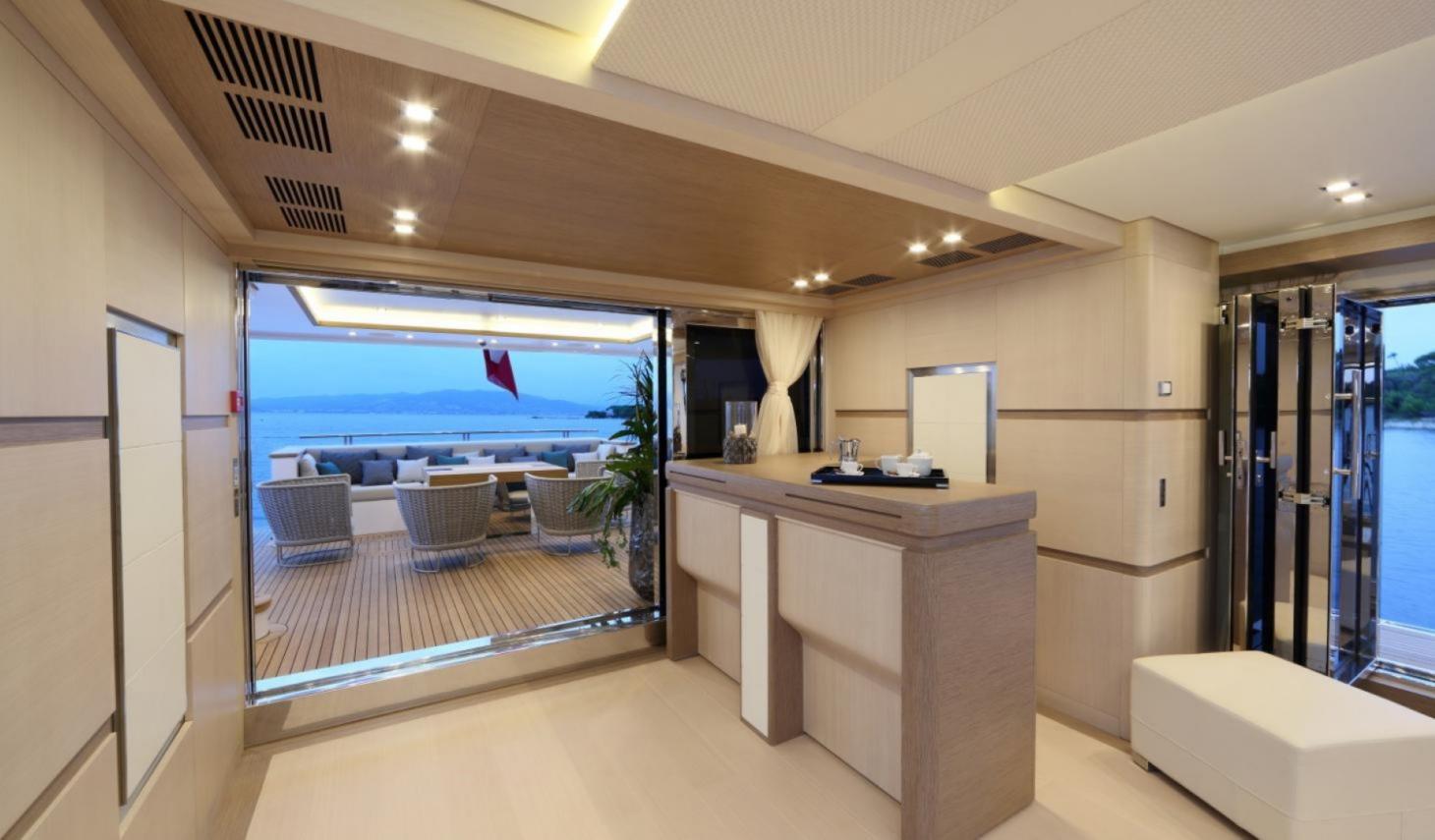 Staircases lead up to the main deck aft where guests can dry off after swimming and enjoy an alfresco meal together at the casual and conversational setting.