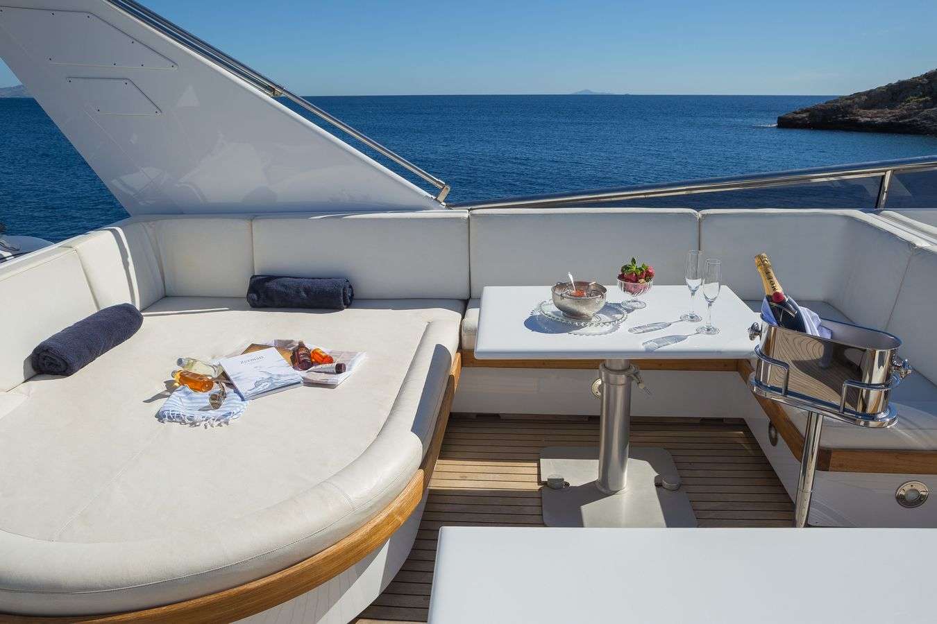 Above, the flybridge aft holds the tender when not in use and the area in front is home to a spacious sofa sunpad that integrates into the L-shaped port-side seating.