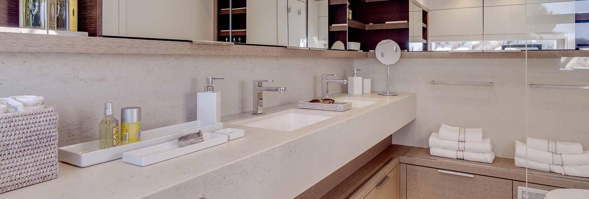 Stairs down the port and starboard sides lead to the guest accommodation, galley and crew accommodation, and the Master suite has a side-terrace for drinks beside the water.