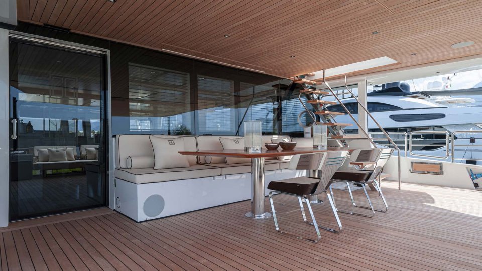 Staircases connect to the main deck aft above, which has a row of sunpads along the stern and an alfresco dining area located beneath the shade of the sundeck overhang.
