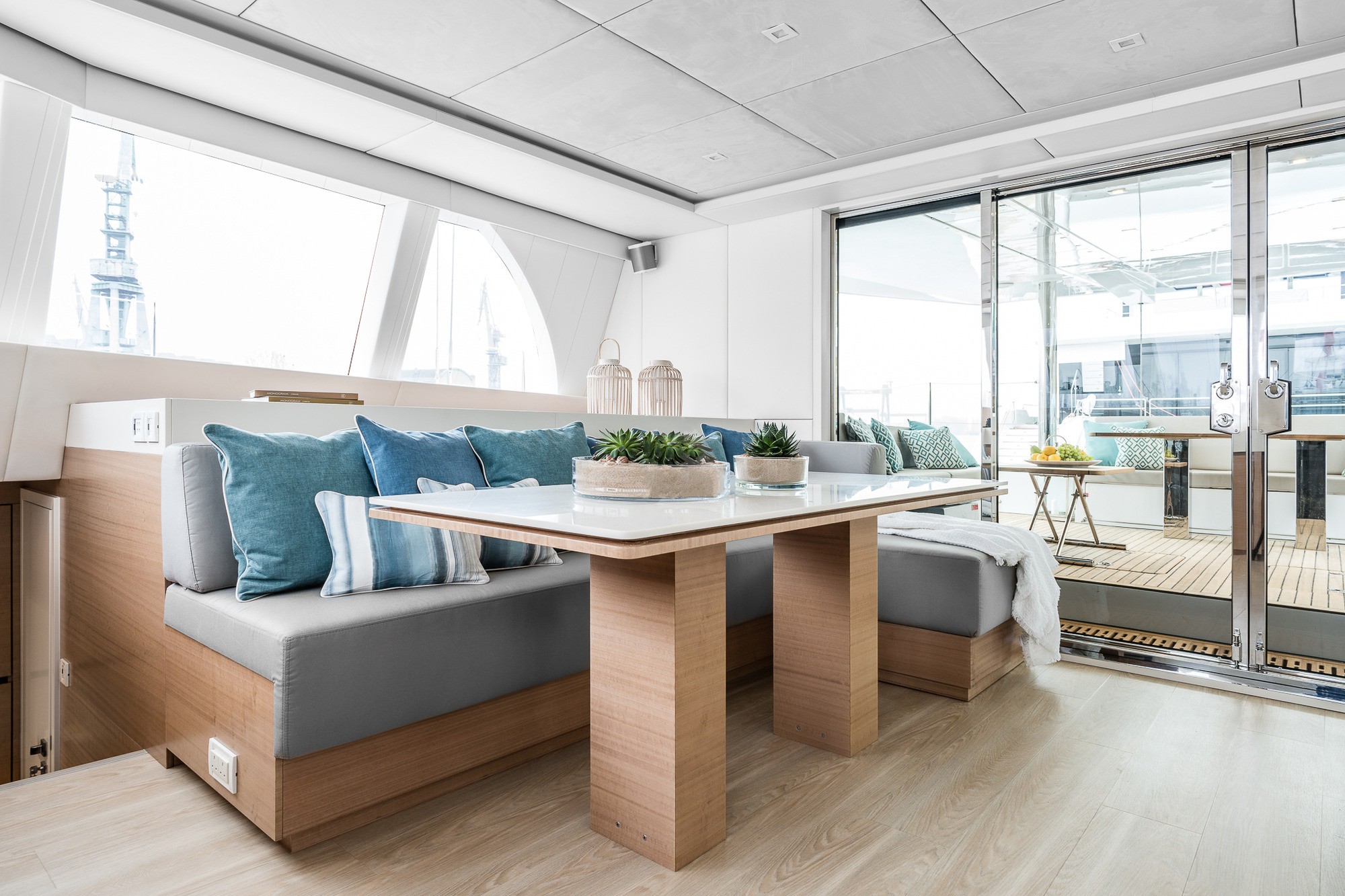 Two trampolines on the bow form the sunbathing area, while above the flybridge offers a C-shaped sofa and a raised table for outdoor living shaded by the hardtop.