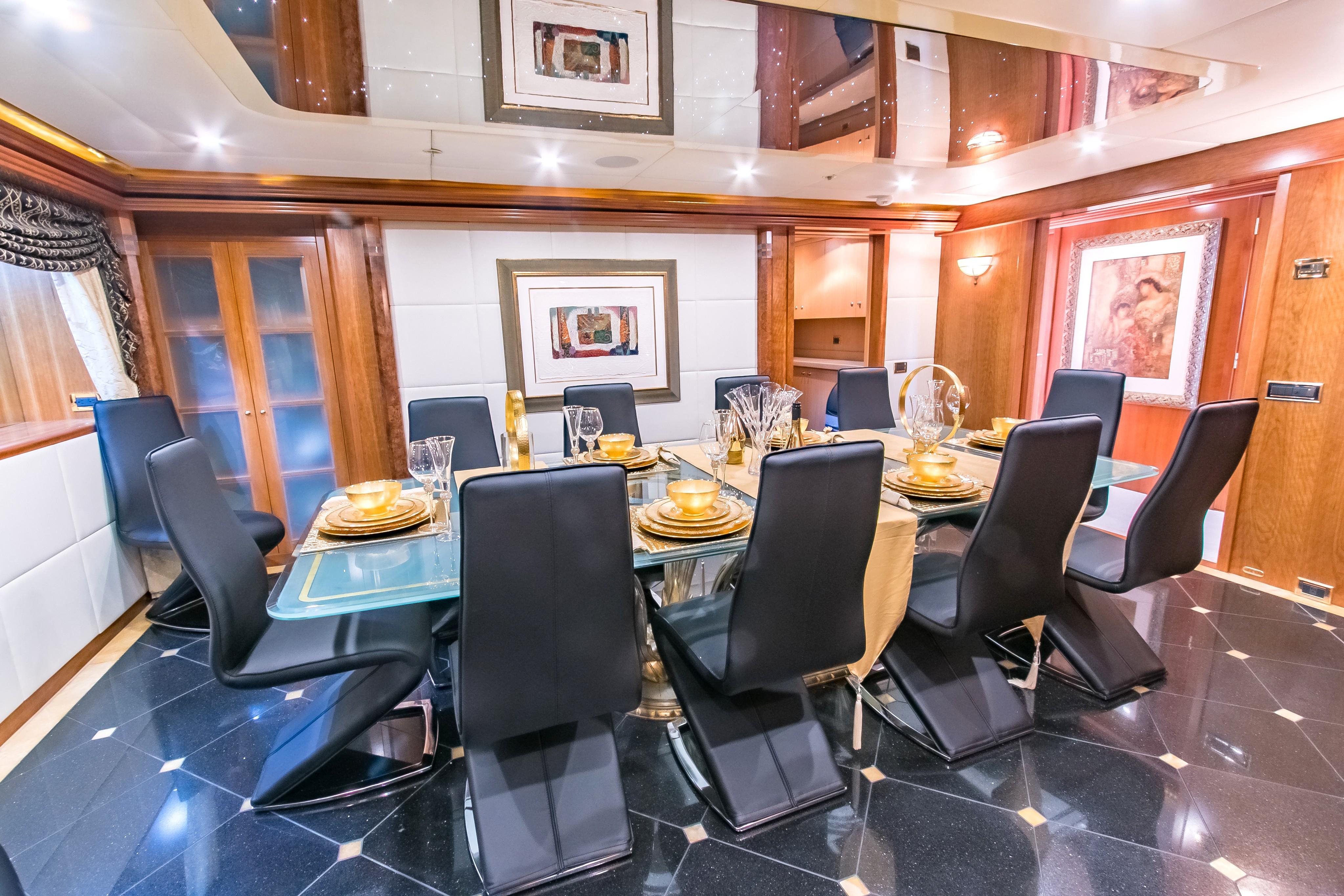 To the aft is the formal dining room, within which there is a table to seat up to 10 guests. Behind, the main salon makes uses two sofas to create an L-shaped formation to efficiently use the space and provide guests with a place ...