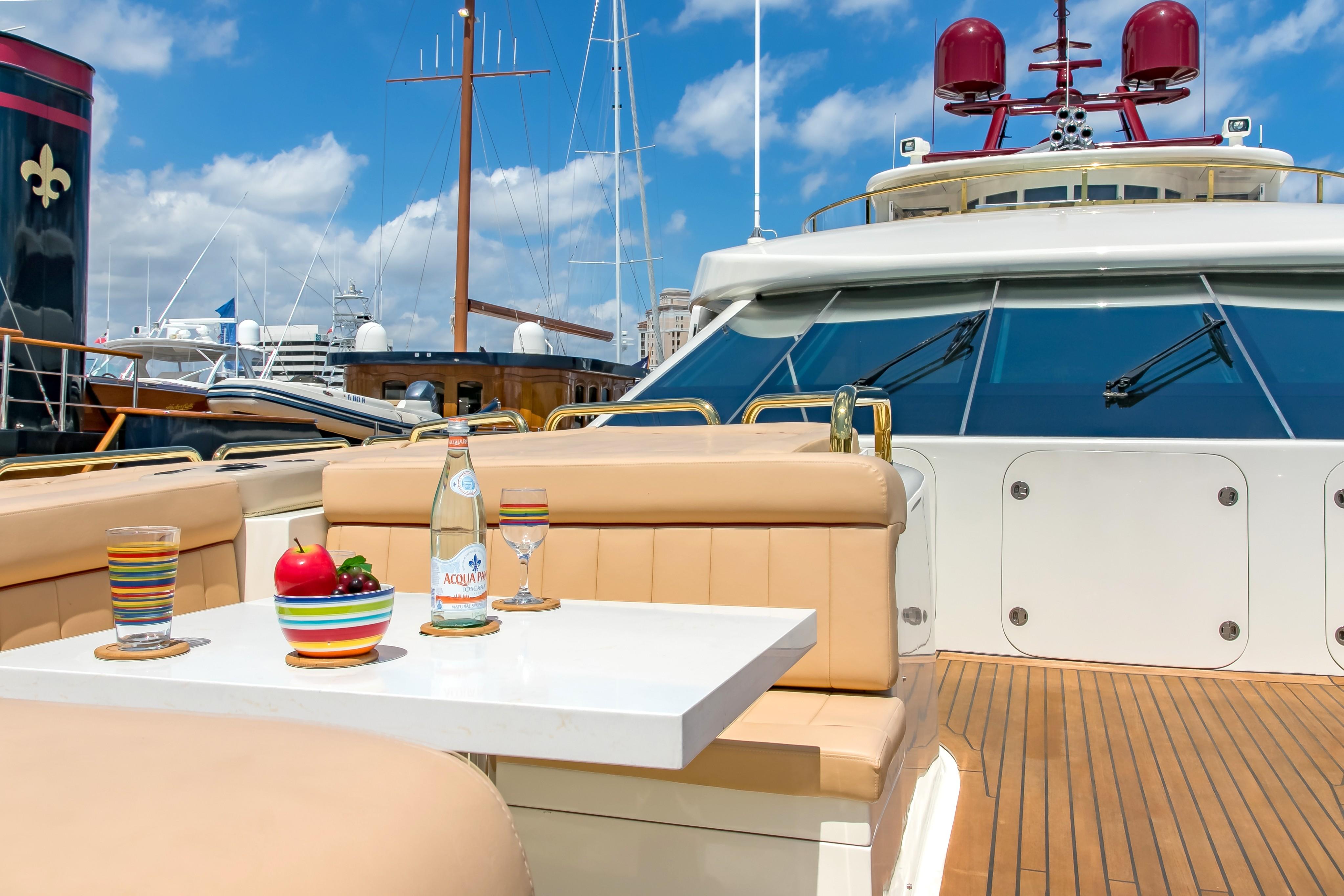 NOTABLE FEATURES OF GOLDEN TOUCH II: ~Three indoor lounges ~Main deck VIP stateroom ~Upper deck Jacuzzi ~Master suite with open plan lounge and private terrace ~Theatre room ~Impressive top speed of 24 knots
