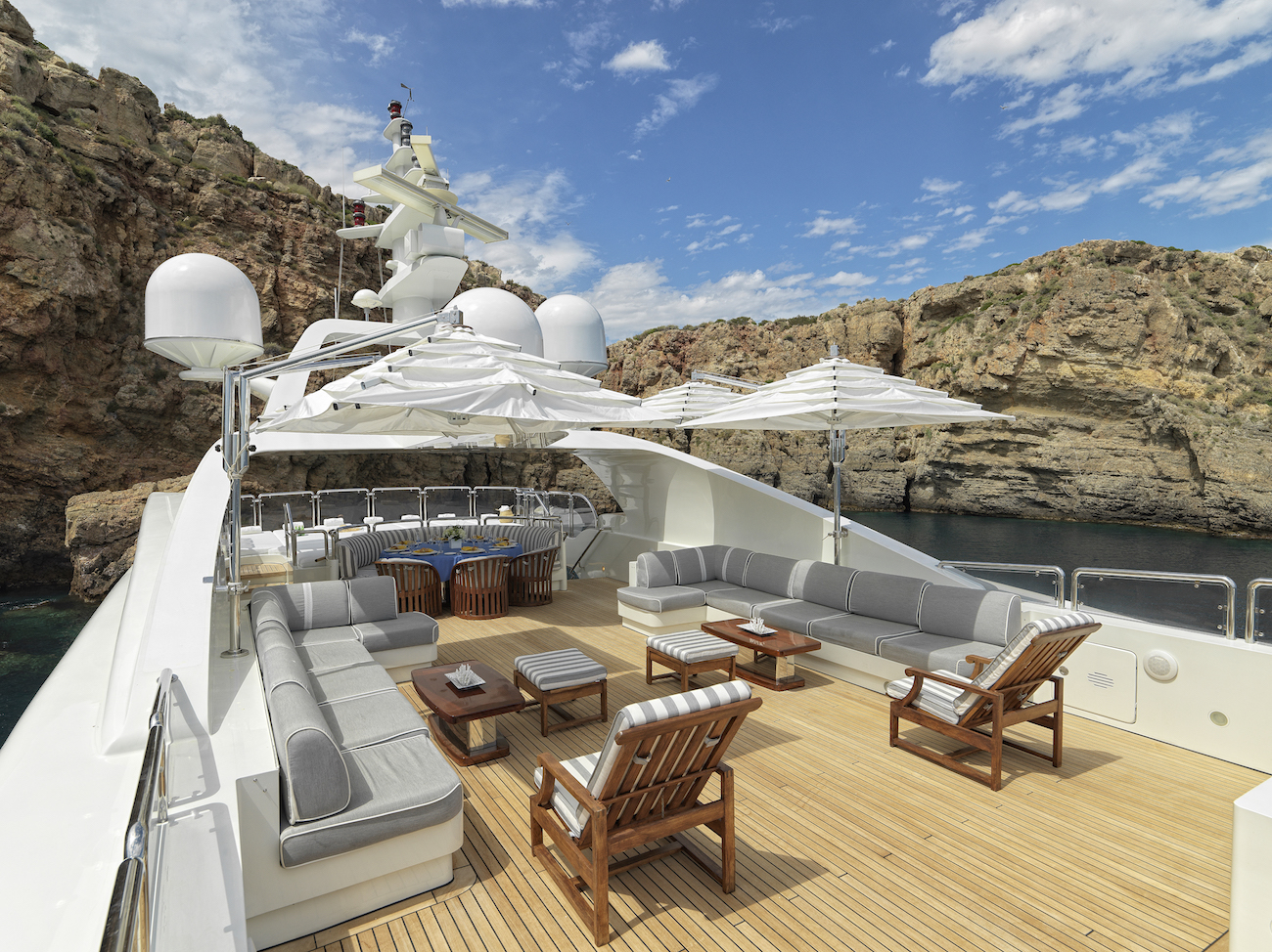 She offers a Spa Pool on her fabulous sundeck as well as a wealth of water toys to provide endless entertainment during any yacht charter (see below). ALEXANDRA’s main deck features two collapsible bulwarks aft of the lounge and dining area which offers guests spectacular panoramic views while dining.