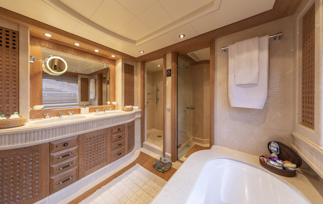 The full beam master suite and owner's study with separate Shower Jet Massage and Spa Pool tub are located on the upper deck. On the main deck, there are two VIP Cabins and the lower deck has a further two guest doubles and two guest twin cabins.
