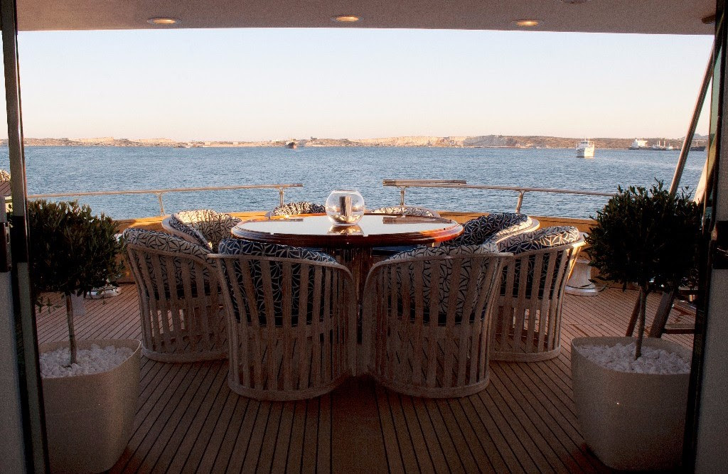 The main deck aft places an alfresco dining table under the flybridge overhang for meals with family and friends at any time of the day.