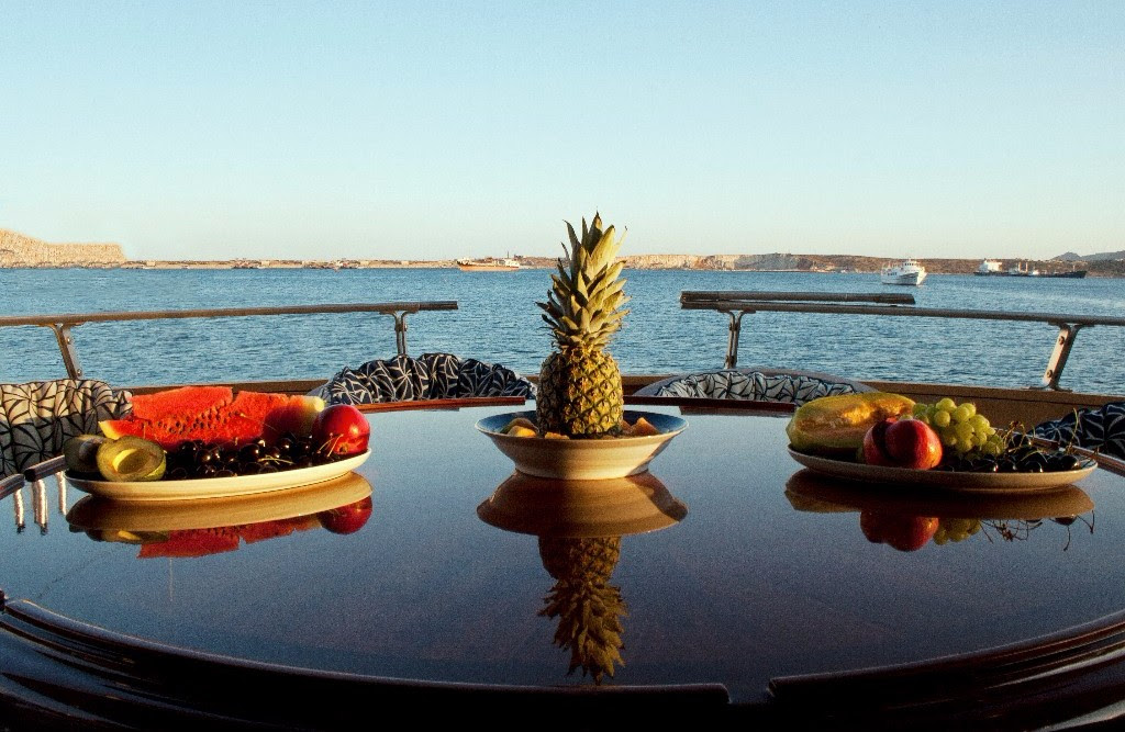 The main deck aft places an alfresco dining table under the flybridge overhang for meals with family and friends at any time of the day.