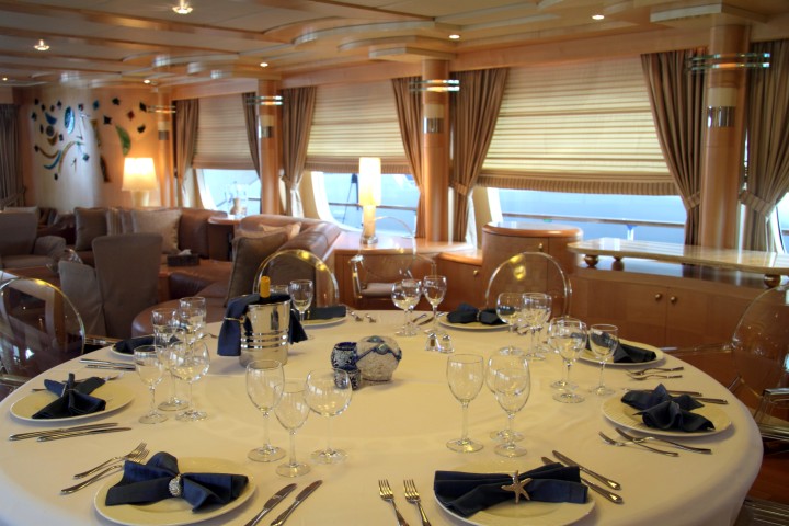 The yacht offers spacious exterior and interior decks, with various possibilities for on board dining, both outdoors and indoors. She was designed by Cor D. Rover for exteriors as well as naval architecture, with interior design by Isabelle Blanchere.