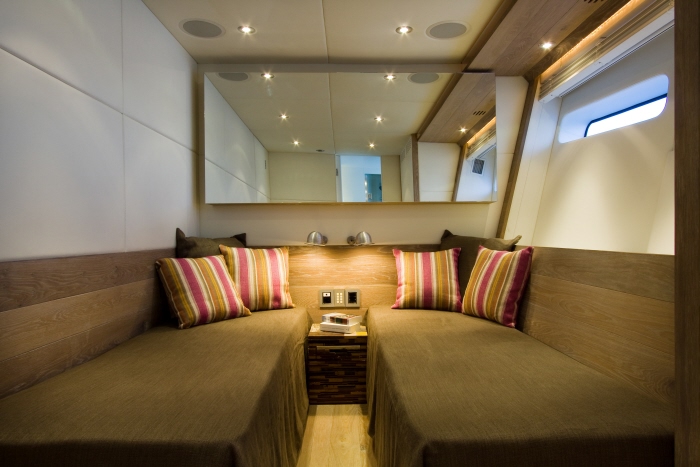 This elegant motor yacht was built by the famous Italian shipyard Tecnomar. Fully equipped in order of electronics, the interior are bright and modern; the saloon has 2 wide sofas with contiguous table, perimetrical fornitures with fridge and ice-maker.