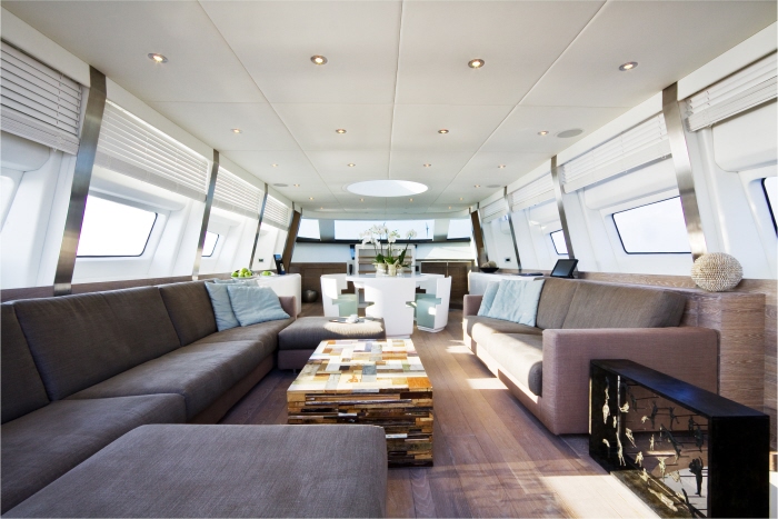 The dining area, with a table seating 12, is forward on the port side while the wheelhouse is on the starboard side. Next to the latter there is a unit which incorporates a 50" plasma TV. With a futuristic dashboard, the harmony is striking below.
