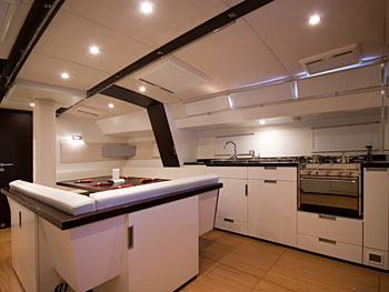 She has a modern refined and minimalist style and a very spacious cockpit. The yacht is finished in wenge and white polyester varnish with a folding teak table in the cockpit.