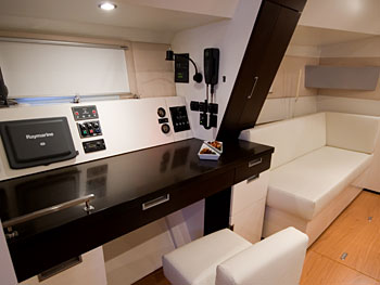 She has a modern refined and minimalist style and a very spacious cockpit. The yacht is finished in wenge and white polyester varnish with a folding teak table in the cockpit.