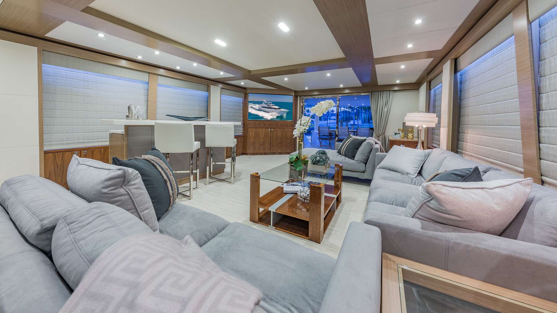 The yacht is fitted with CAT C-32 engines and two Northern Lights generators of 38kW, powering her up to a speed of 24 knots, while her cruising speed is 21 knots.