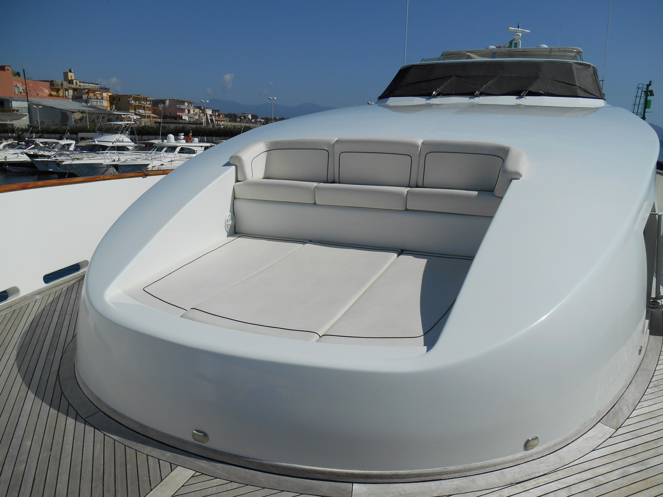 Forward are two raised sofas allowing guests to enjoy navigation. Behind these are two large fixed sunbeds, well sheltered from wind. A large dining table easily accommodates 12 guests for lunch/dinner.