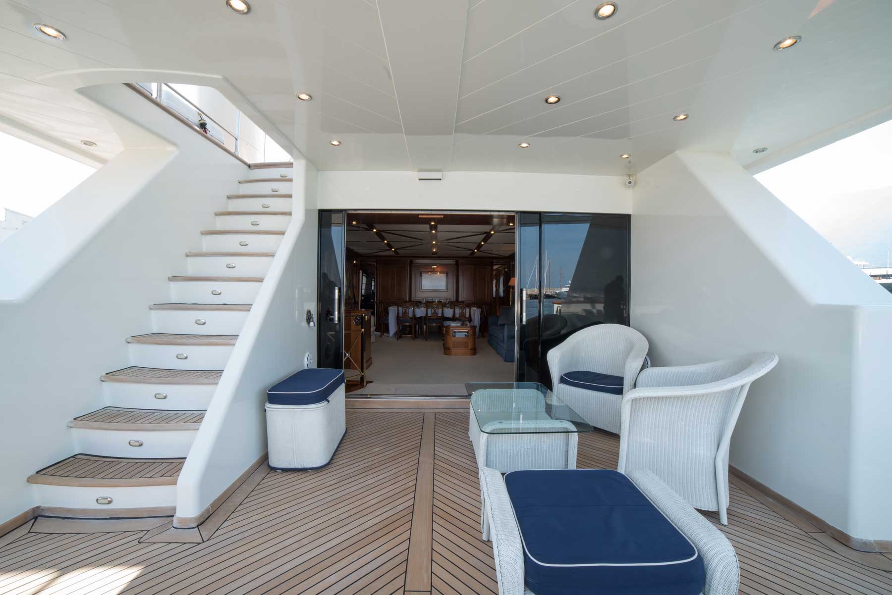 The aft deck is partly covered and offers comfortable outdoor furniture as well as a fixed sofa.
