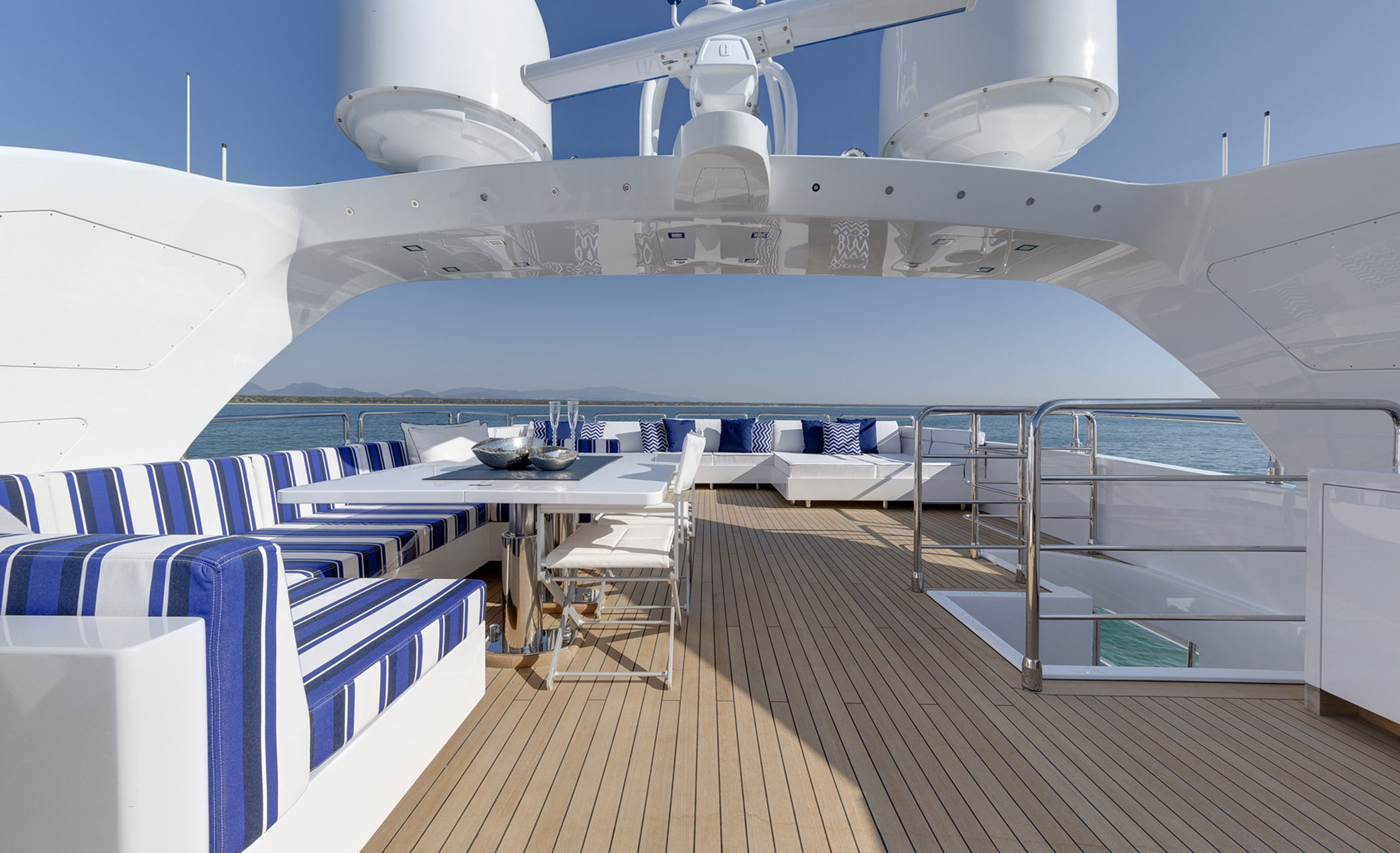 There is room close to the doors to the main salon for a square alfresco dining table to seat all 12 guests. The Jacuzzi is placed on the foredeck and is surrounded by sunpads, while an alfresco dining area divides them from the forward sunpads.