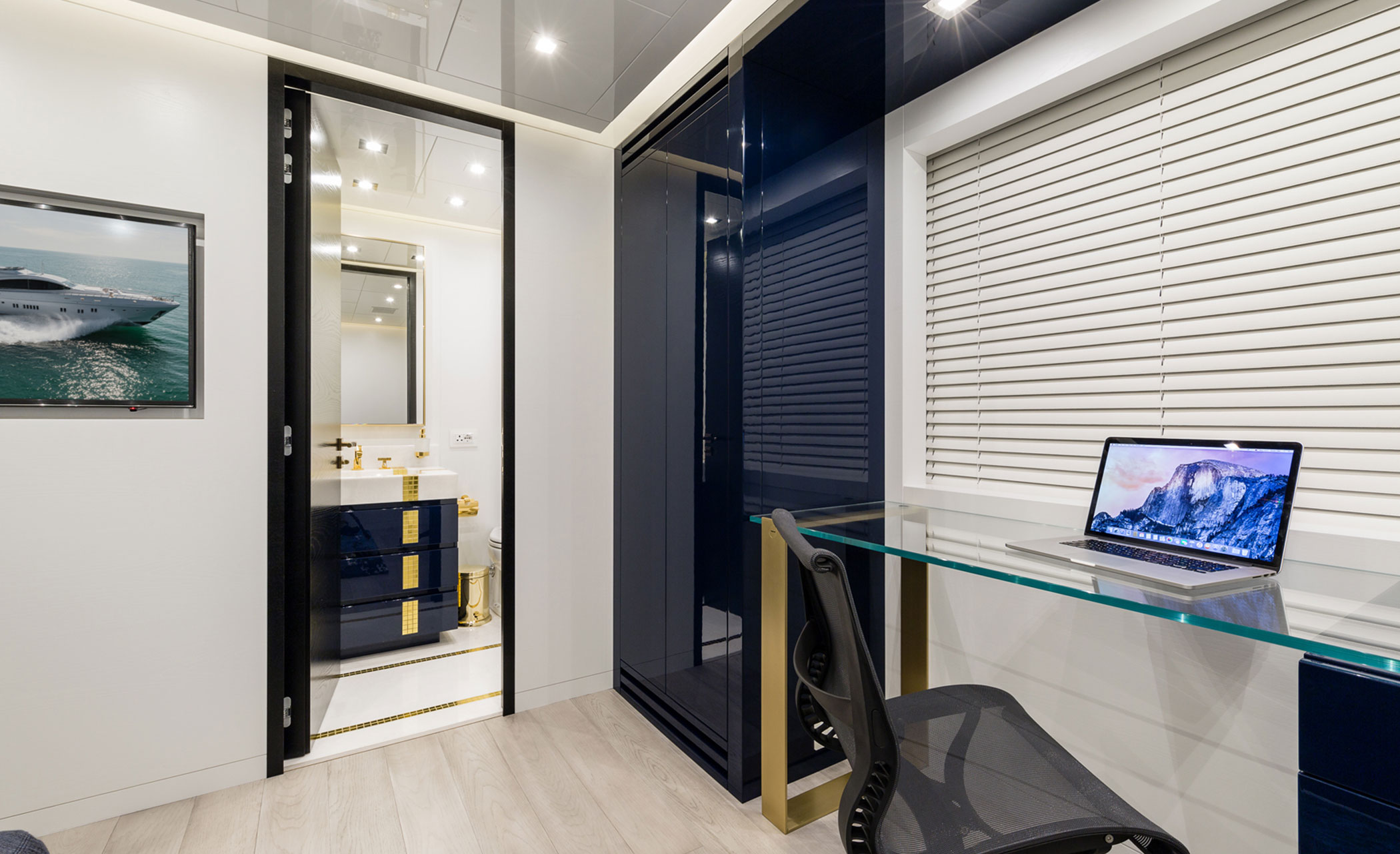 The open plan environment also includes a marble port-side bar and a starboard seating area where a plush sofa is placed under the large windows and metallic and textures coffee tables. Two armchairs beside the doors out onto the ...