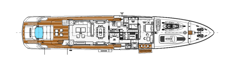 Staircases connect up to the main deck aft, which provides guests with a sun-exposed lounge of two sofas and two armchairs around a sizeable coffee table, and the area can be covered with a canvas for shade or protection from the ...
