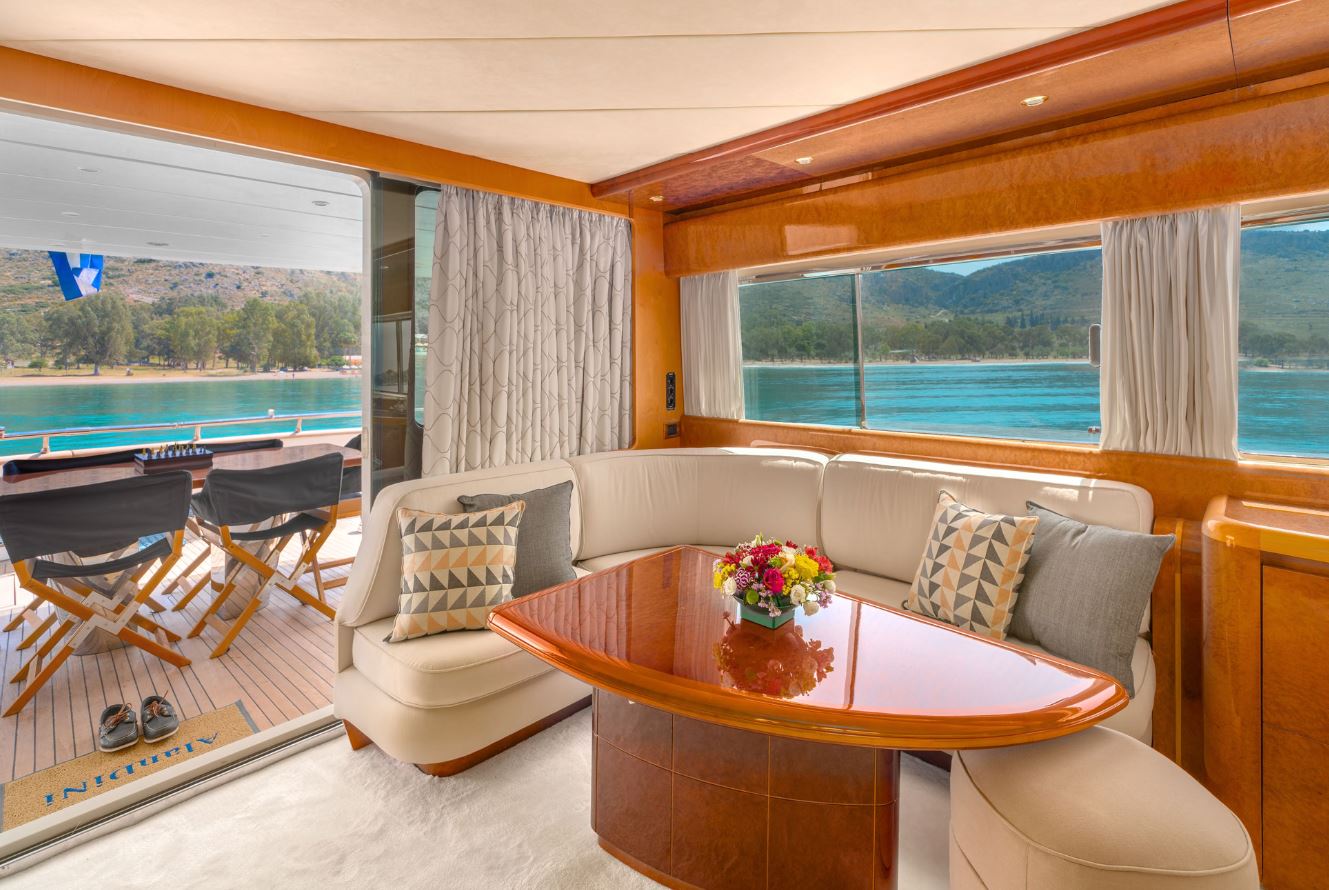 Her main salon features the lounge aft with plush leather seating, and formal dining placed forward.