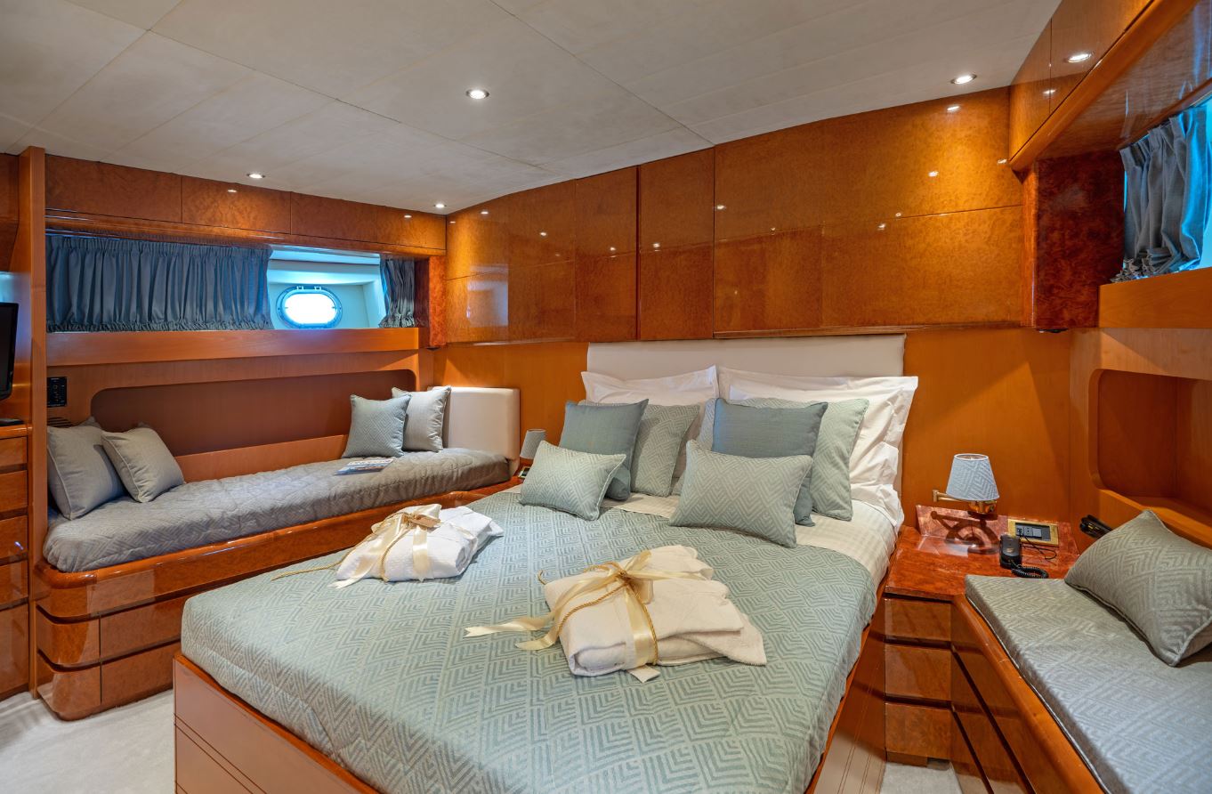 She was built in Italy by Maiora and offers accommodation for up to 11 guests in 4 cabins, with an attentive and professional crew of 4.