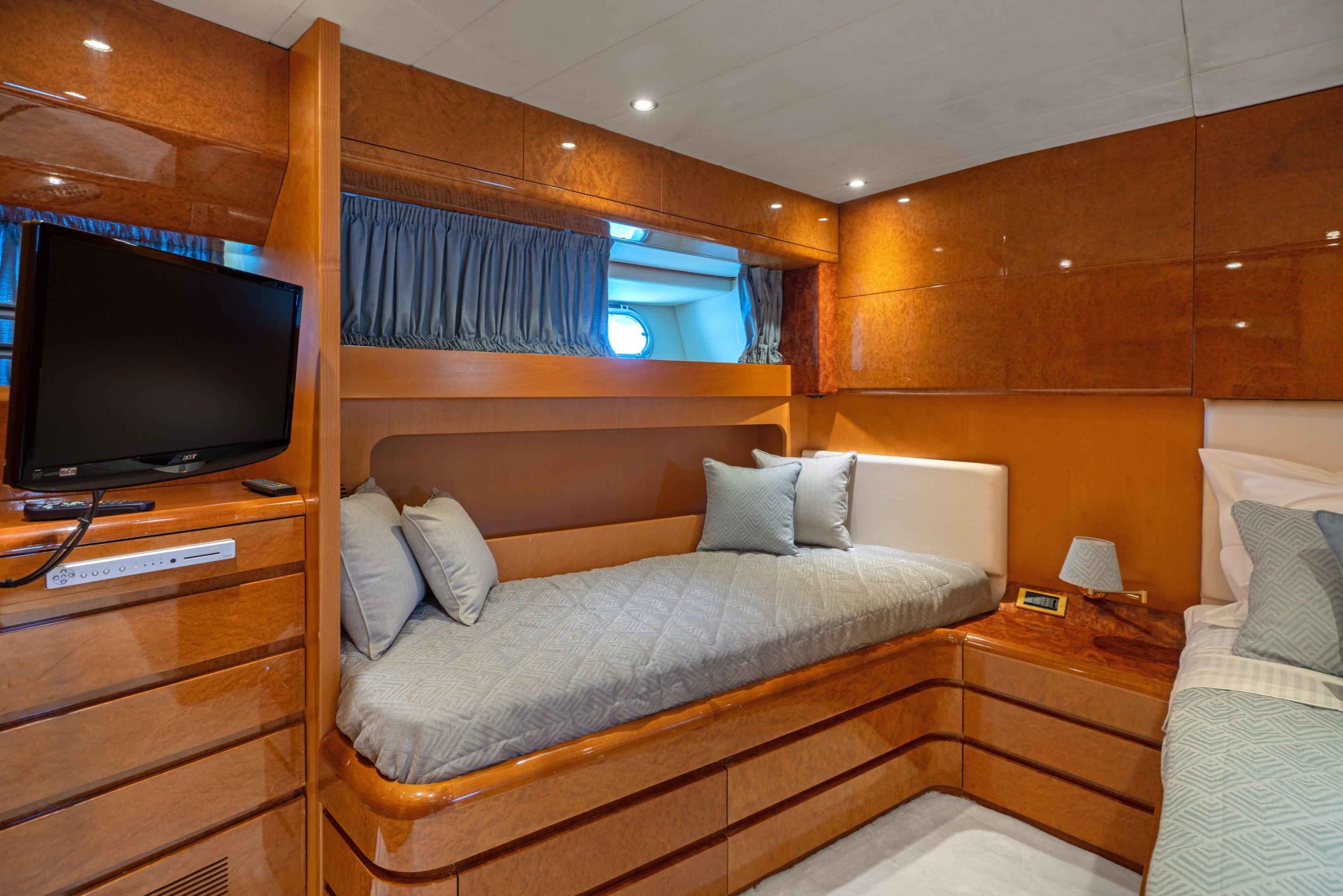 The staterooms include one master suite with a king bed and walk-in wardrobe as well as private ensuite facilities. Furthermore there is a VIP stateroom and two twin cabins each with an additional Pullman berth. All cabins have ensuite bathrooms and LED TVs.