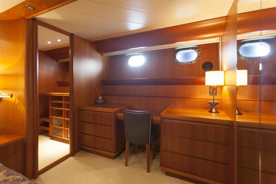 The master suite has a king-sized bed with an office area, AV system and phone with internal/external communications. The ensuite bathroom can be found to port, while starboard has the walk-in wardrobe.