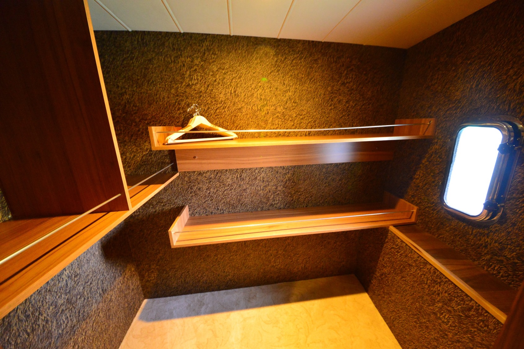 Her main salon has a custom-built sofa on the port side, with a coffee table. Forward a flat-screen TV and entertainment systems are available. To starboard is a service station. Panoramic windows infuse the space with great natural light and outward views.