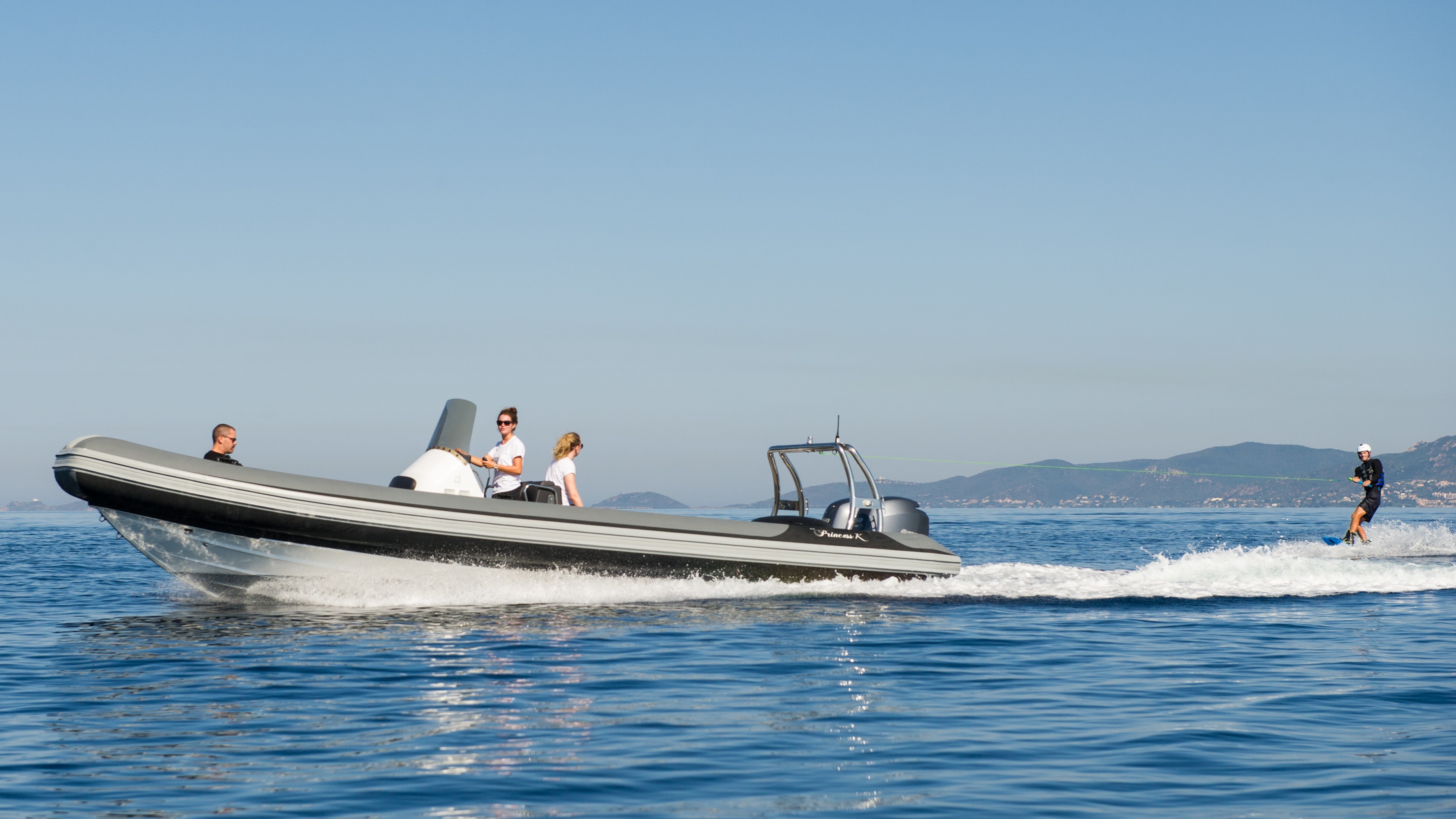 A staircase inside the beach club grants access to the main deck aft, where four plush sofas are placed around a coffee table in the shade. Along the port and starboard sides, the gunwales fold down to create side-terraces beside ...